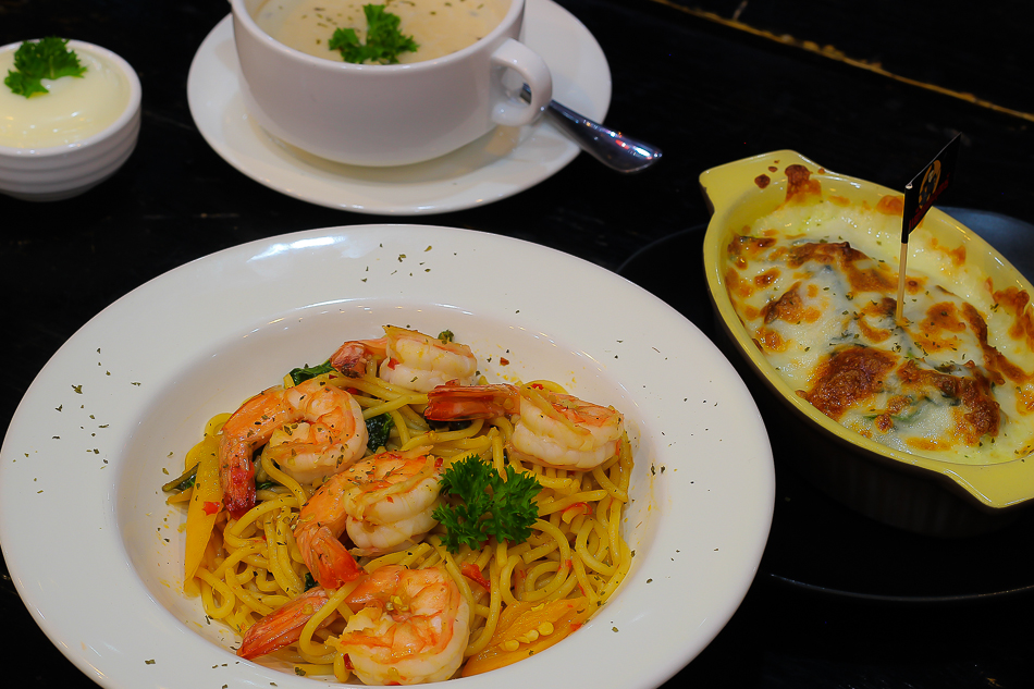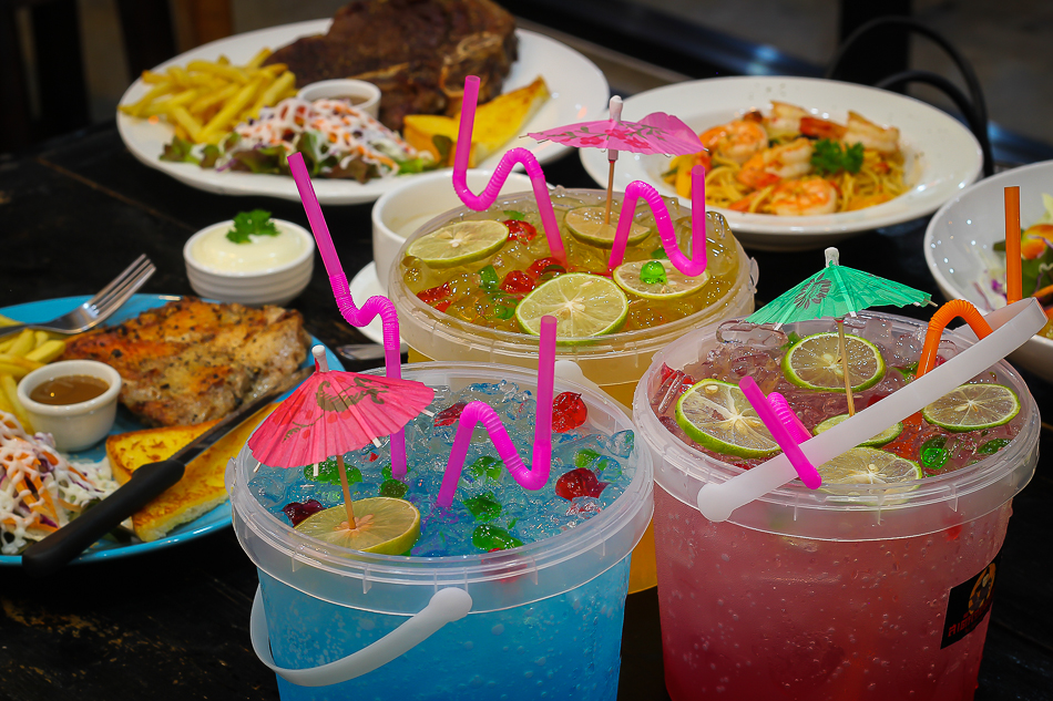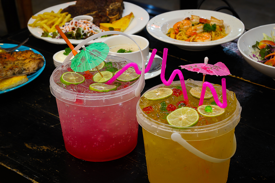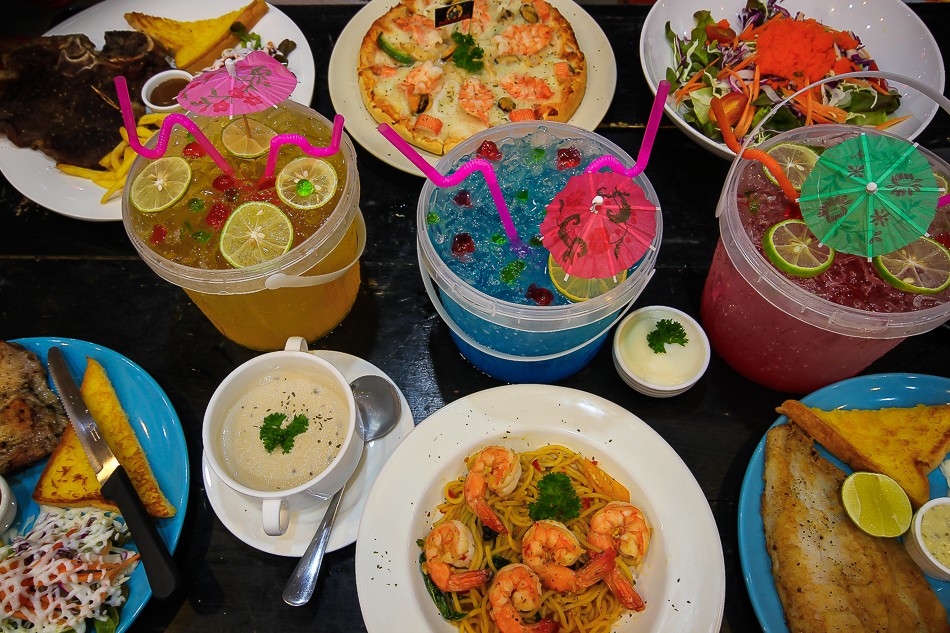 เมนูเยอะจนอยากจะกินทุกอย่างแต่ก็กลัวทานไม่หมดเลยเอาเบา ๆ ก่อน นี่เบาแล้วนะ นี่ขนาดสั่งแบบเบา ๆ แล้วนะ เราทานอะไรบ้างนั้นก็จะมีเป็น สเต็กโคขุนทีโบน สเต็กปลาย่าง สเต็กไก่พริกไทยดำ พิซซ่าหน้าซีฟู้ด สปาเก็ตตี้ขี้เมากุ้ง ผักขมอบชีส สลัดกุ้งสด ซุปเห็ด เครื่องดื่มเป็บัทเก็ต 3 ถังชื่อจอมยุทธ์ บลู จอมยุทธ์เรด และจอมยุทธ์ บราว เท่านี้ค่ะอยากจะกินเยอะกว่านี้แต่ไม่ไหวแล้ว อิ่มมาก