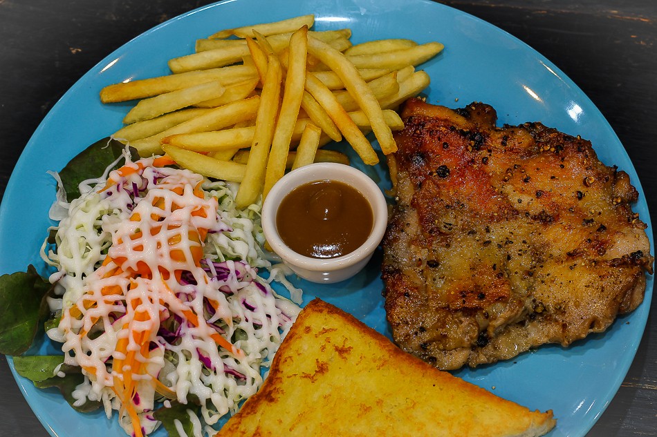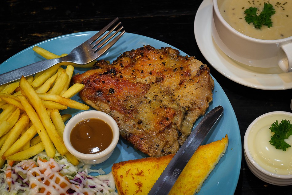 สเต็กไก่พริกไทยดำที่ร้านสเต็กจอมยุทธ์จานนี้ เนื้อจะนุ่ม ๆ จิ้มน้ำจิ้มรสเด็ดเข้ากันมากค่ะ อร่อยจริง ๆ นะ เราได้ชิมสเต็กทุกจานทานทุกอย่างที่สั่งค่ะ อยากจะนิดละหน่อยแบ่งกันกิน ผลัดกันชิมกับคนไปด้วย
