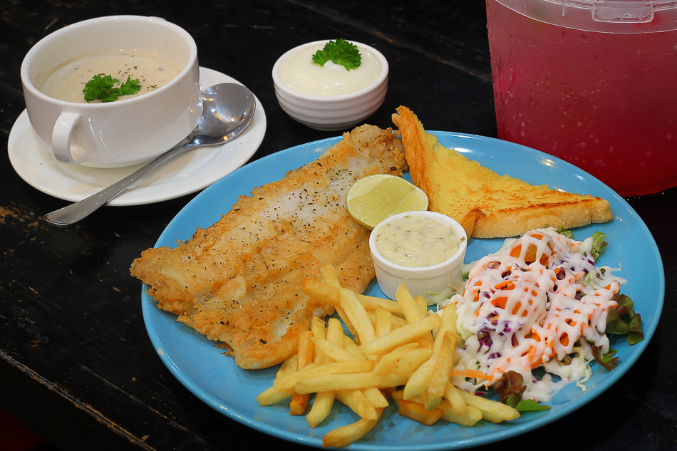 จานนี้เป็นสเต็กปลาย่าง ของโปรดเราอีกอย่างจานนี้คงราคาถูกสุดแล้วมั้ง ไม่ถึงร้อยถ้าจำไม่ผิดเดี่ยวค่อยหาดูราคาอีกที อร่อยมาก และที่เห็นเป็นถ้วยขาว ๆ นั้นเป็นซุปเห็ดนะคะ ซดตอนร้อน ๆ หอมและฟินไปอีก