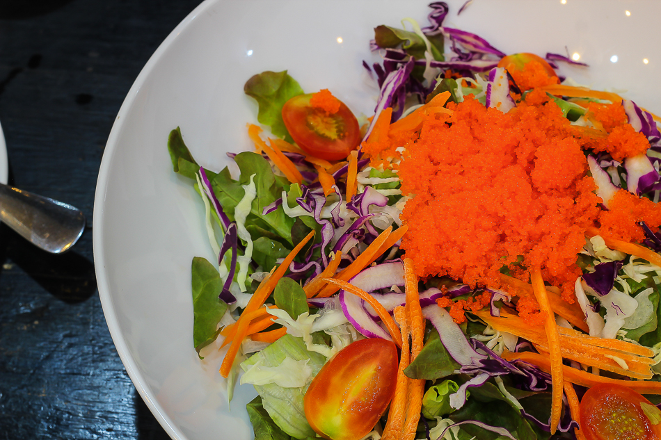 สลัดไข่กุ้งจานใหญ่ ๆ ก็มา ไข่กุ้งกรุบ ๆ กับผักกรอบ ๆ สด ๆ น้ำสลัดเข้มข้น