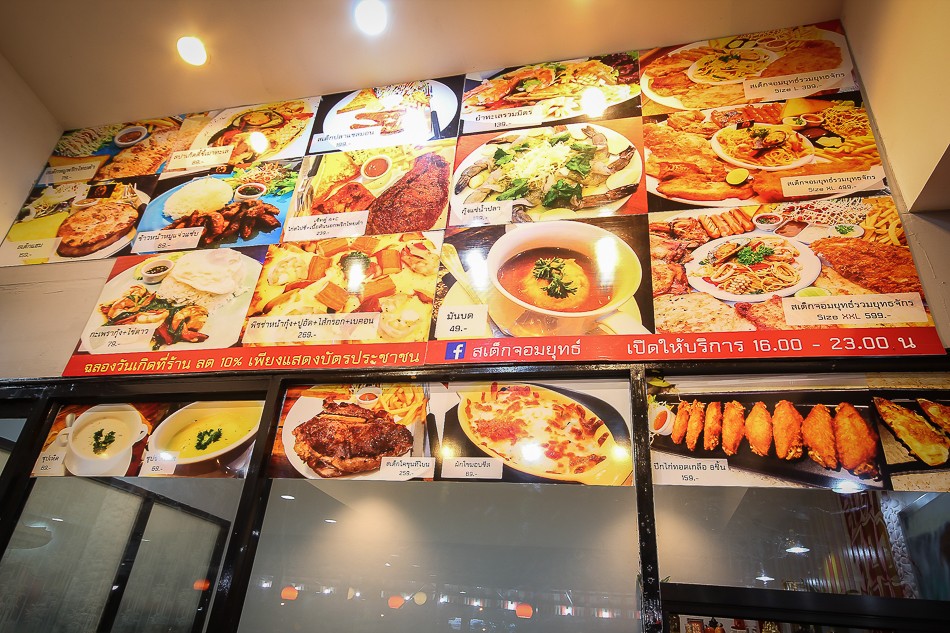 สำหรับร้านสเต็กจอมยุทธ์ถ้าเทียบกับร้านสเต็กทั่วไปก็ถือว่าเป็นร้านขนาดกลางไปถึงใหญ่นะคะ มีหลายโต๊ะเหมือนกันเป็นห้องแอร์เย็น ๆ นั่งทานกันสบายใจเลย ร้านเปิดเวลา 11.30 น. - 22.30 น. ค่ะ เป็นร้านที่ถือว่ามีเมนูอาหารหลากหลายมากไม่ได้มีแค่สเต็กอย่างเดียว ที่สำคัญคือแปลกสักหน่อยสำหรับเราคือมีบัฟเฟ่พิซซ่าด้วย ยังไม่เคยเห็นที่ไหนเหมือนกันนะรู้สึกจะราคา 499 บาทต่อคนทานพิซซ่าได้ไม่อั้นในเวลา 2 ชั่วโมง โอ้โห! น่าลองนะแต่รอบนี้เราสั่งแบบปกติมากินเพราะเรามาทานสเต็กค่ะ