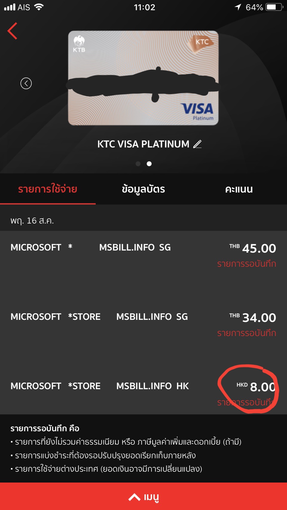 ส่วน HKD 8 ทำรายการไม่ผ่าน ก็ยังโดตัดเงินอีก ทางแบงค?บอกว่า ทางแบงค์ไม่ได้ตัด ทุกยอดบิลที่ขึ้นมาจาก Microsoft