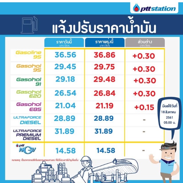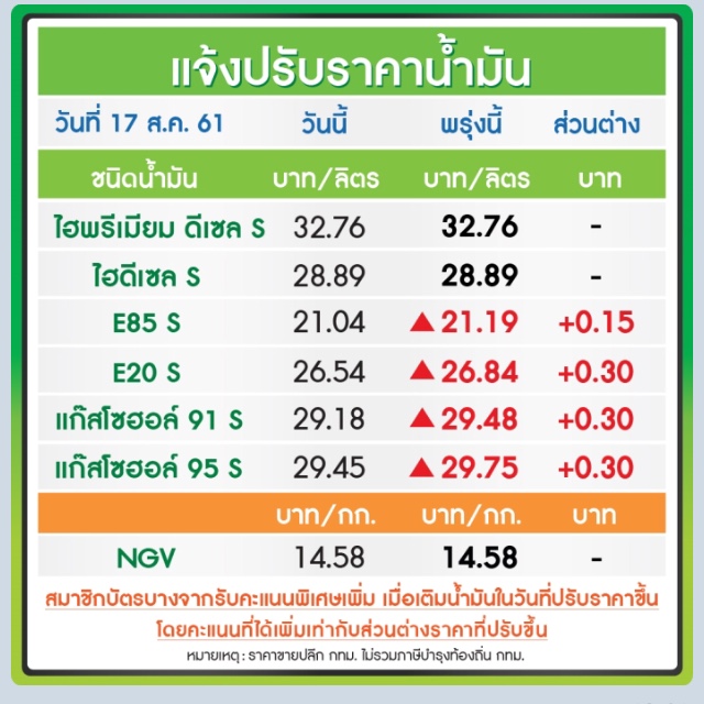 พรุ่งนี้ ปตท. บางจาก ปรับขึ้นราคาน้ำมัน รายละเอียดตามตารางข้างล่างค่ะ