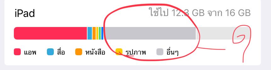สอบถามการจัดเก็บพื้นที่ของ iPad ครับ ตรงที่แสดงสีเทา ตรงอื่นๆ มันคือข้อมูลอะไรครับ ผมจะได้ไปลบถูก (ตามภาพเลยครับ) ขอบคุณครับ