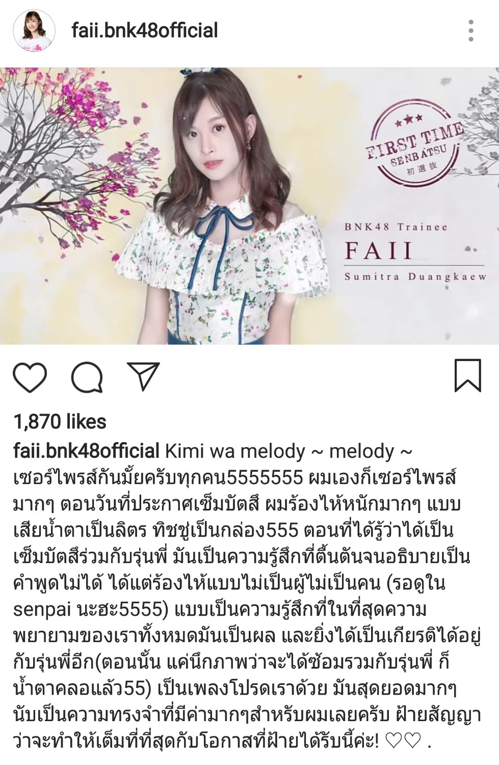 ยินดีด้วยมาก ๆ เลยนะ ใกล้จะครบ 6 ปีแล้วที่คอยได้แต่ลุ้น ว่าอย่างน้อยจะได้ออกมายืนข้างหน้ากับเขาบ้าง หรือได้เห็นชื่อเธอในการประกาศ Senbatsu หวังจะได้เห็นชื่อเธอว่าเป็น First time Senbatsu บ้าง จนไม่ได้