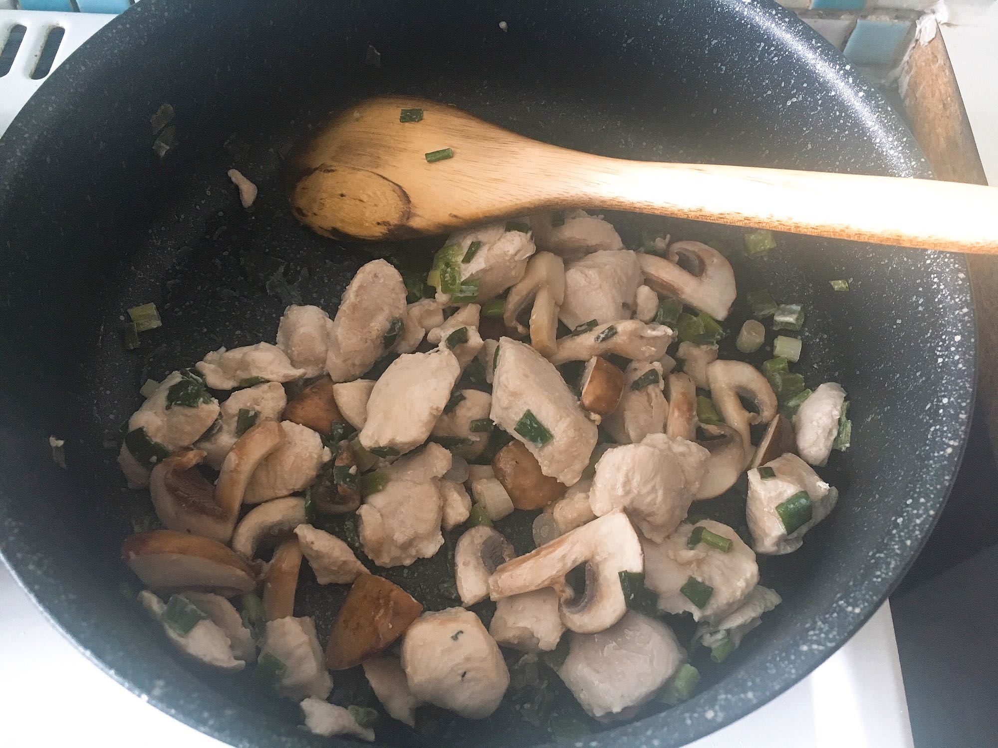 4.) พอกระทะร้อน ให้ใส่ไก่หั่นเต๋าและต้นหอมลงไปผัด5นาทีค่ะ (เราแอบใส่เห็ดเหลือๆไปด้วย)