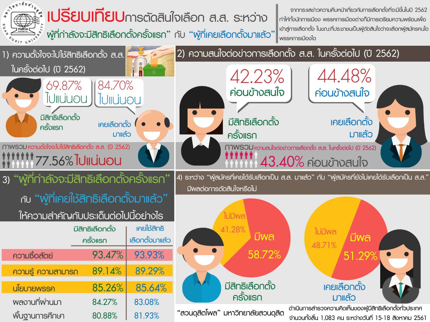 "สวนดุสิตโพล" มหาวิทยาลัยสวนดุสิต ดำเนินการสำรวจความคิดเห็นของผู้มีสิทธิเลือกตั้งทั่วประเทศ จำนวนทั้งสิ้น 1,083 คน ระหว่างวันที่ 15-18 ส.ค. 2561 สืบเนื่องจากกระแสข่าวความคืบหน้าเกี่ยวกับการเลือกตั้งที่จะมีขึ้นในปี 2562 ทำให้นักการเมือง พรรคการเมือง ต่างก็มีการเตรียมความพร้อมเพื่อเข้าสู่การเลือกตั้ง ในขณะที่ ประชาชนเป็นผู้ตัดสินใจว่าจะเลือกผู้สมัครคนใด พรรคการเมืองใด เพื่อสะท้อนความคิดเห็นของประชาชนที่มีต่อการตัดสินใจเลือก ส.ส. ระหว่าง "ผู้ที่กำลังจะมีสิทธิเลือกตั้งครั้งแรก" กับ "ผู้ที่เคยเลือกตั้งมาแล้ว" สรุปผลได้ ดังนี้