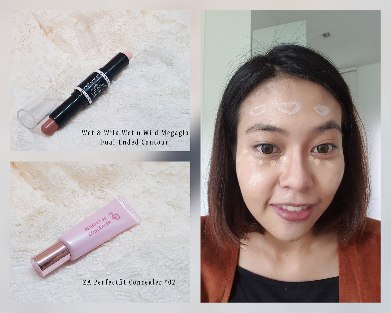 งานผิวยังไม่จบ ขอใช้คอนซีลเลอร์กลบรอยหมีแพนด้ากันหน่อยด้วย ZA Perfect Fit Concealer เบอร์ 02 ใช้ไม่กี่จุด ปิดรอยคล้ำได้ดีเลยค่ะ เมื่อผิวหน้าเข้าที่ข้าทาง ดูเนียนเป็นธรรมชาติแล้ว ก็ขออสร้างมิติให้ใบหน้าหน่อยค่าา ขอลบกราม ลบความเหม่งเล็กน้อย งัดดั้งนิดนึงด้วย Wet n Wild Megaglo Dual-Ended Contour Stick ซึ่งเป็น Contour และ Highlight ในแท่งเดียว เกลี่ยให้เนียนด้วยฟองน้ำได้เลยค่ะ