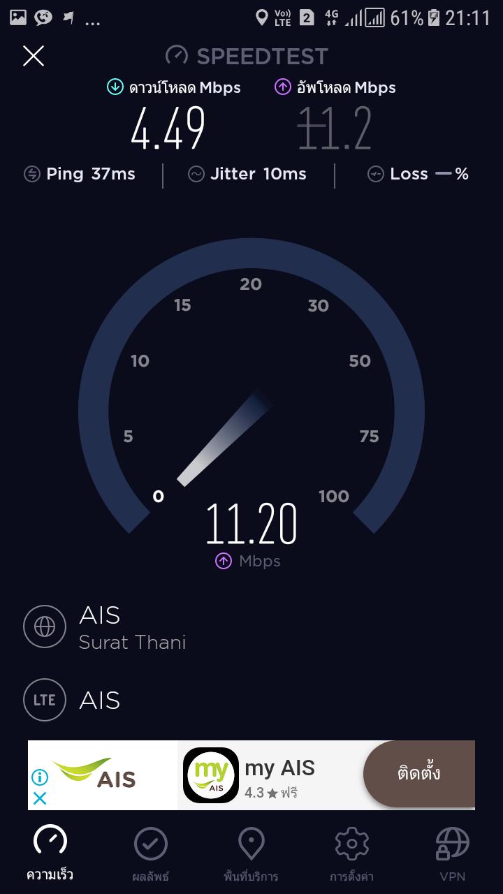 ผมสมัครเน็ต AIS 10Mbps รายสัปดาห์ ผมทดลองเทสสปีด ทำไมวิ่งได้แค่นี้เองเหรอครับ กระทั่งที่เสารับสัณณาญอยู่ติดกับบ้านไม่เกิน200เมตร คุ้มไหมเนี่ยกับค่าสมัคร ....