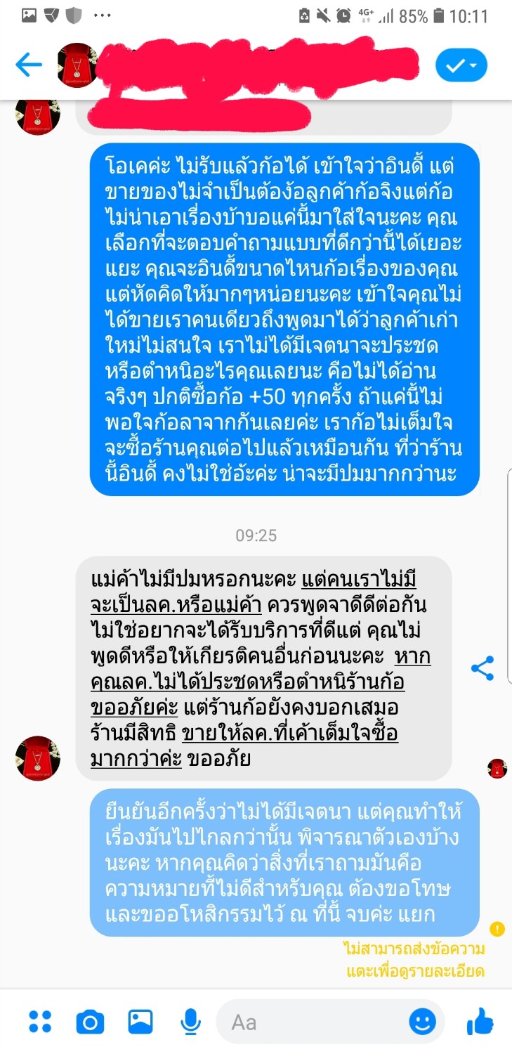ว่าจะไม่โพส แต่ทนกับนิสัยแบบนี้ไม่ได้ ขอหน่อยละกันค่ะ เราเคยซื้อของกับร้านนี้ 2-3 ครั้งแล้ว ปกติก็ส่ง ems +50 บาทตลอด ก็โอนไป โอนไวด้วยทุกครั้ง เขาก็ส่งมาไม่เคยมีปัญหา แต่ครั้งนี้ ไม่รู้เพราะด้วยความแม่ค้าอินดี้ หรือคำถามเรามันไปโดนจุดไหนของเค้า ส่วนนึงเราก็อ่านโพสไม่ละเอียดด้วย เพราะความรีบ ดูแค่ราคาขายแล้วก็รีบทักไปถาม เรายอมรับว่าเราไม่อ่านให้หมด กลัวของหมดจีงรีบถามไป แต่เราอยากรู้ว่าสิ่งที่เราถามไป มันผิดมากหรอ ถึงได้รับคำตอบแบบนี้ อยากให้แม่ค้าพิจารณาคำพูดตัวเองบ้างนะคะ คุณขายของนะ ใช่คุณไม่จำเป็นต้องง้อลูกค้าแต่ถ้าคุณจะเป็นแบบนี้มันไม่โอเคอ้ะ เขาบล๊อคเราไปก่อน เลยยังไม่เห็นข้อความสุดท้าของเรา อยากให้เขาเห็นค่ะ จะได้ไม่ติดค้างกัน
