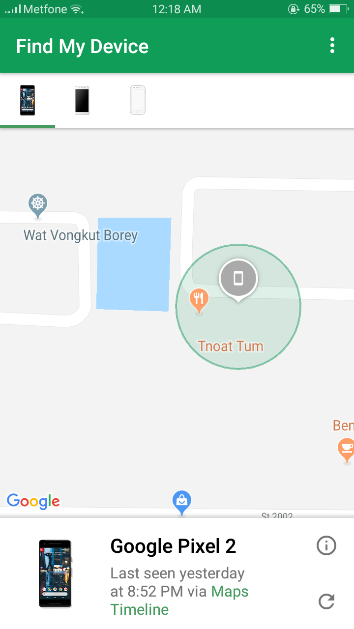 เราทำการเปิดหาข้อมูล มือถือที่หายไปคือ Google Pixel 2 (เศร้ามากเพราะเพิ่งได้มายังไม่ถึง 2 เดือนเลย) จากนั้นดาวน์โหลดแอพที่ชื่อว่า Find Device โชคดีเรามีบัญชีของ Google จึงทำการใส่รหัสและกดหาสัญญาณเครื่อง แน่นอนเครื่องได้ถูกปิดไปแล้ว และสัญญาณสุดท้ายคือ(ตามภาพ)