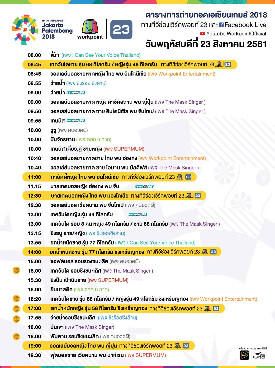 โปรแกรมการถ่ายทอดสด เอเชียนเกมส์ 2018 ทางเครือข่ายของ Workpoint Entertainment, PPTV HD 36 และ AIS Play