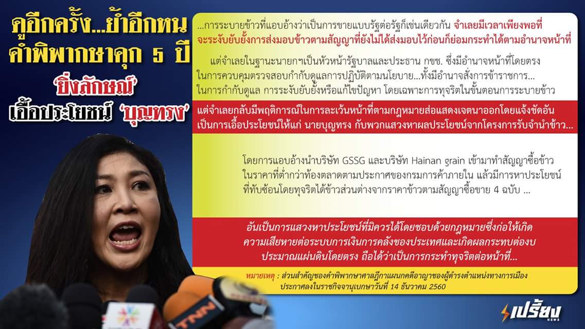 ศาลฎีกาแผนกคดีอาญาของผู้ดำรงตำแหน่งทางการเมือง อ่านคำพิพากษาในคดีจำนำข้าว ให้จำคุกจำเลย น.ส.ยิ่งลักษณ์ ชินวัตร อดีตนายกรัฐมนตรี เป็นเวลา 5 ปี ไม่รอลงอาญา พร้อมออกหมายบังคับคดี นำตัวมารับโทษตามอาญา...