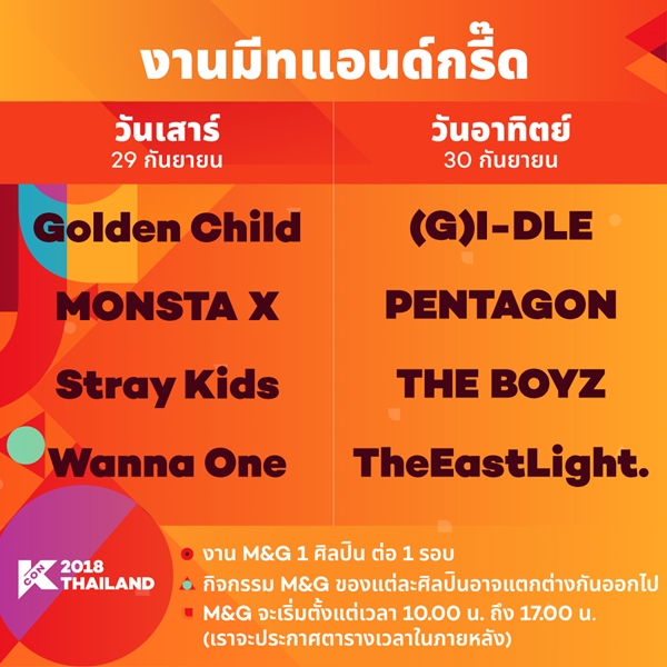 โดยมี นิชคุณ 2PM รับหน้าที่เป็นพิธีกรพิเศษ ด้วยความเป็นที่รู้จักและมีจำนวนแฟนเพลงมากมายจากทั้งฝั่งประเทศไทยและเกาหลี นิชคุณจึงเหมาะสมที่สุดที่จะนำคลื่นเกาหลีฟีเวอร์มาหาแฟนเพลงชาวไทย นอกจากนี้ยังมี DJ Soda (ดีเจ โซดา) ดีเจสาวสวยสุดฮอตที่มีฐานแฟนคลับมากมายทั่วโลก มาเป็นแขกรับเชิญพิเศษที่จะมาร่วมสร้างสีสันความสนุกให้กับงานในครั้งนี้อีกด้วย และพลาดไม่ได้อย่างยิ่ง กับศิลปินที่จะร่วมมีทแอนด์กรี๊ดพบปะกับแฟนเพลงอย่างใกล้ชิด ทั้ง Wanna One (วอนนา วัน), MONSTA X (มอนสตา เอ็กซ์), Golden Child (โกลเดน ไชลด์), Stray Kids (สเตรย์ คิดส์), (G)I-DLE (ยอจา อาอีดึล), PENTAGON (เพนทากอน), The Boyz (เดอะ บอยซ์) และ TheEastLight. (เดอะอีสท์ไลท์)