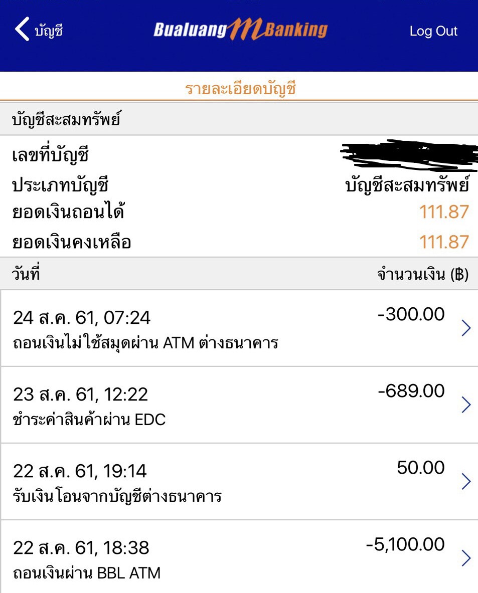 เนื่องจาก วันนี่ 24 สิงหาคม 2561 เราได้ทำการกดเงินจากตู้ ATM แบงค์บัว ซึ่งยอดเงินคงเหลือล่าสุด จำนวน 1,100บาท
