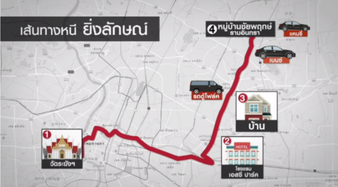 รายงานจากการสอบสวน ระบุว่า รถเบนซ์ น.ส.ยิ่งลักษณ์ มุ่งหน้าไปที้บ้านพักของ พ.ต.อ.ชัยฤทธิ์ อนุฤทธิ์ ในหมู่บ้านชัยพฤกษ์ เพื่อไปขึ้นรถโตโยต้า แคมรี่ มี พ.ต.อ.ชัยฤทธิ์ เป็นคนขับแคมรี่มุ่งไปที่ชายแดน อ.อรัญประเทศ จ.สระแก้ว มีด่านความมั่นคงจับภาพรถแคมรี่ไว้ได้ แต่รถคันนี้ไม่ได้พาข้ามแดน มีรถกระบะปริศนาอีกคันหนึ่งมารับ