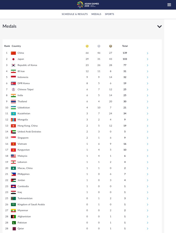 สรุปอันดับเหรียญล่าสุดของการแข่งขันเอชียนเกมส์ 2018 ประจำวัน 24-8-2018