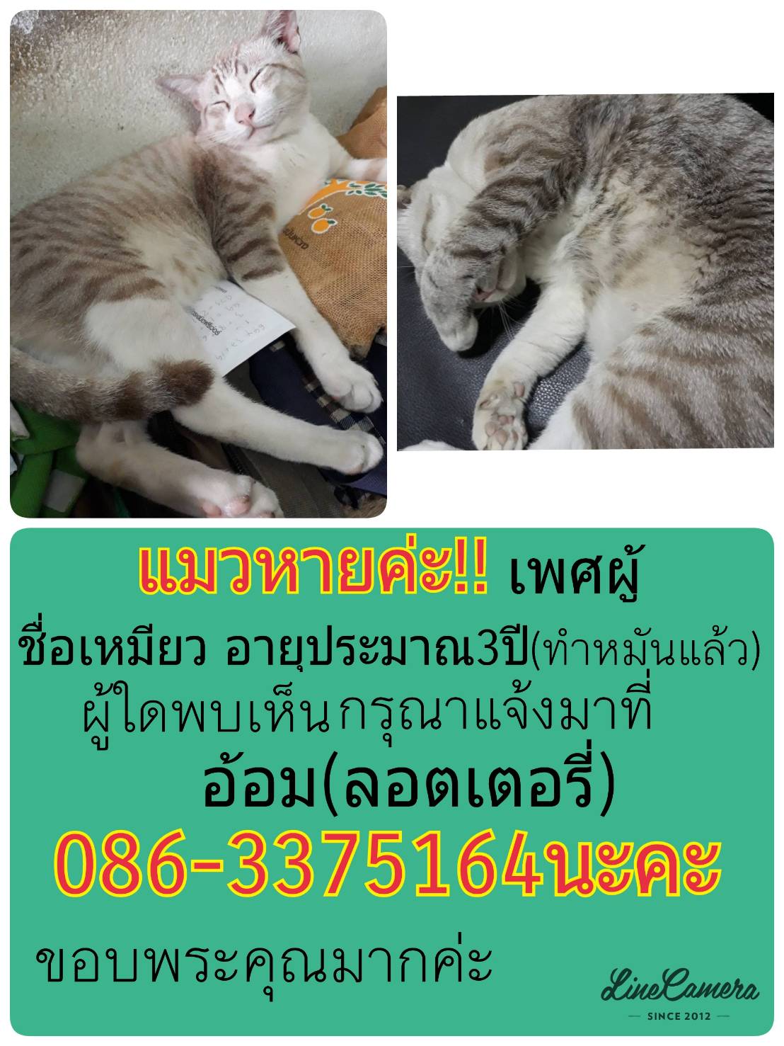 แมวเพศผู้หาย ชื่อเหมียว พิกัด เคหะธานี 4 สะพานสูง กทม. หายไปวันนี้ (23/8/61)