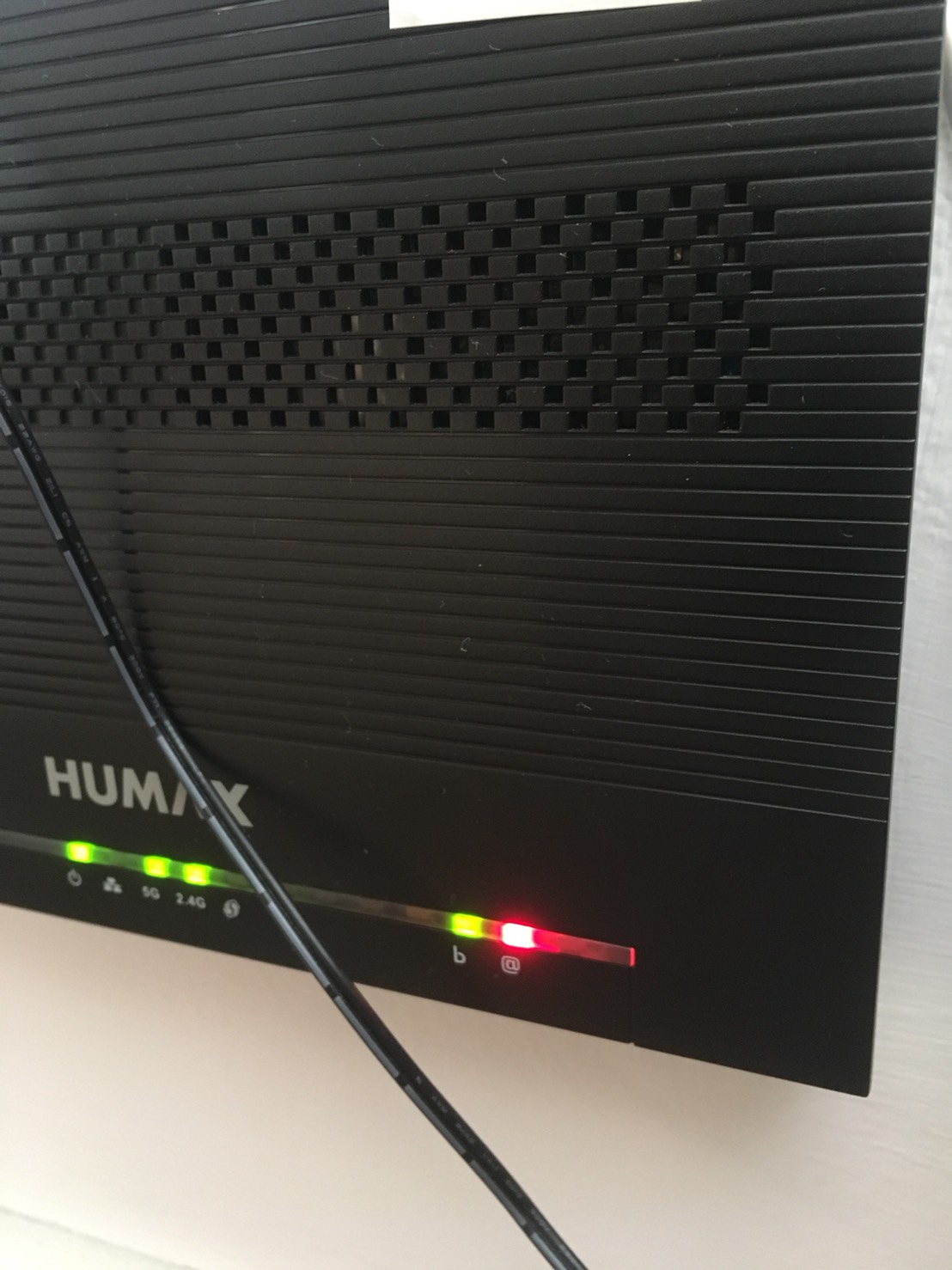 เมื่อ 2 วันก่อน เหมือนจะมีเหตุการณ์ไฟดับที่ตึกข้างๆคอนโดผม และมันทำให้เน็ตผมเล่นไม่ได้ (ไม่รู้ว่ามันเกี่ยวกันหรือเปล่านะ) แล้วพอผมปิด-เปิด router ใหม่ ก็เล่นไม่ได้ ไปดูที่โมเดมเหมือนจะเห็นสัญลักษณ์สีแดงแบบนี้ครับ...