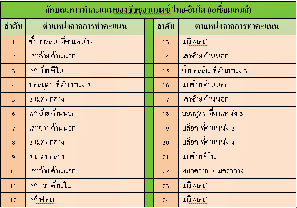 ซึ่งโดยปกติจะไม่ค่อยเห็นใครเล่นลูกลักษณะนี้(เพราะไลน์วิ่งมันแคบ) ส่วนแมตซ์เจออินโดบิ๋มทำแต้มได้ 24 แต้ม ดังตารางด้านล่าง
