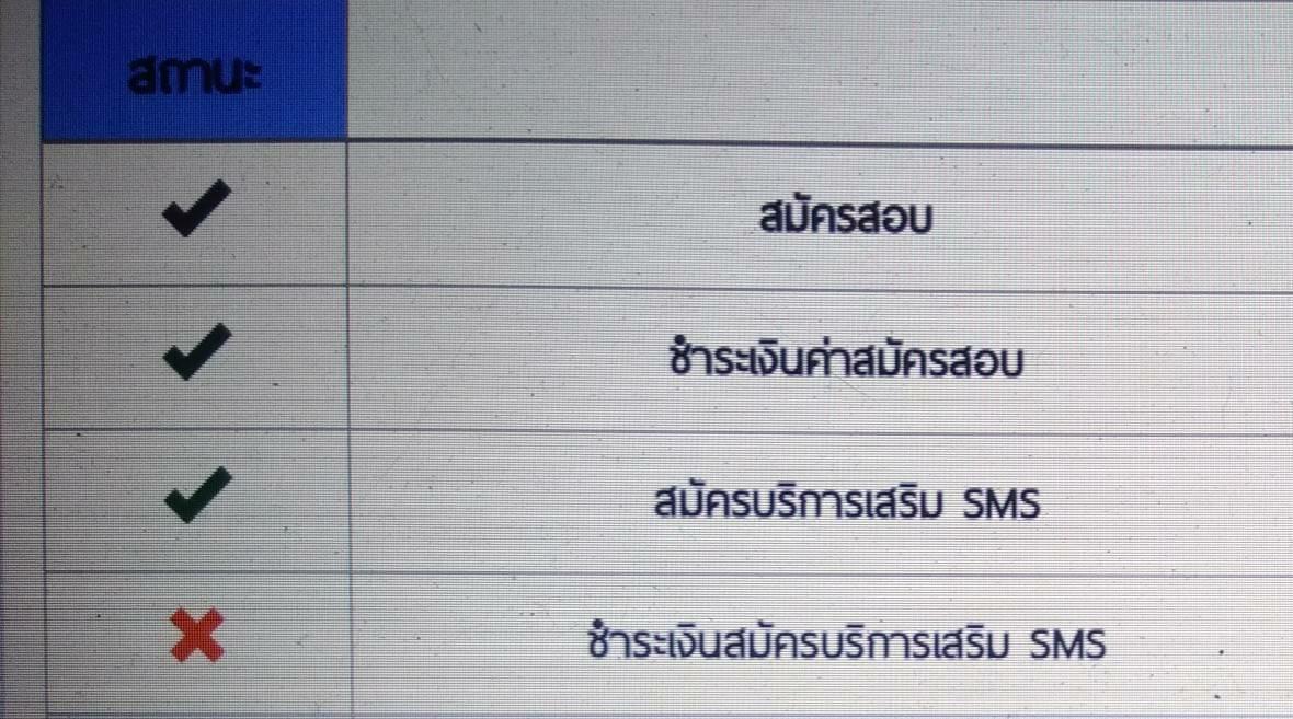 จากนั้นกลับมาตรวจสอบสถานะ ขึ้นเครื่องหมายกากบาทสีแดง(ยังไม่ได้ดำเนินการ)ในส่วนของ SMS จึงสมัครรับข้อมูลภายหลังเพราะคิดไปเองว่าจะตัดค่าบริการ20.- ผ่านมือถือ แต่ปรากฏว่าต้องไปจ่ายที่ธนาคาร