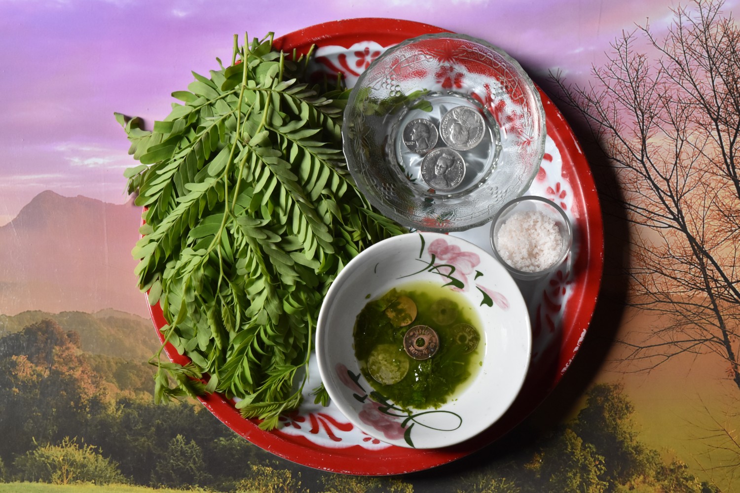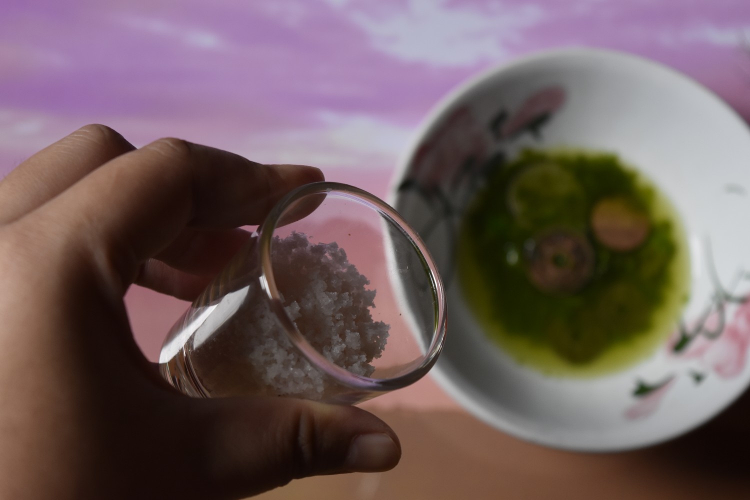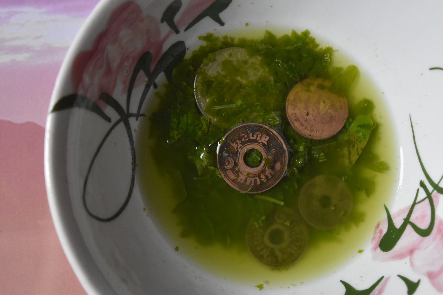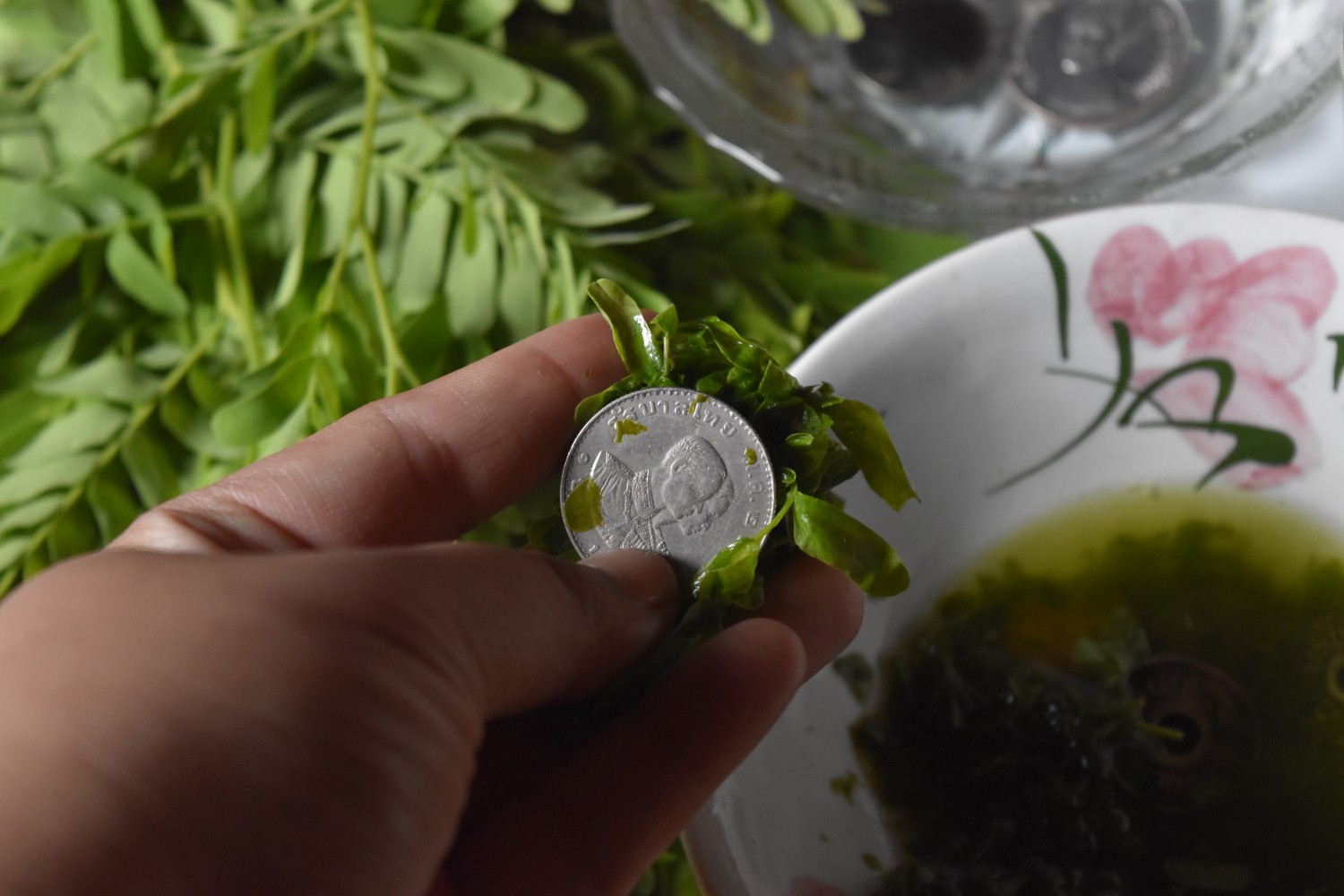2.เมื่อได้ใบมะขามอ่อนมาแล้ว..ก็เด็ดก้านและใบใส่ภาชนะพร้อมผสมกับน้ำเปล่าและเกลือพอเหมาะ จากนั้นนำเหรียญของเราใส่ลงไปแช่ไว้สัก 30 นาที เพราะความเปรี้ยวที่เป็นกรดของใบมะขามจะกัดกร่อนสนิมที่ติดอยู่ในเหรียญ จึงง่ายต่อการทำความสะอาดมากขึ้น