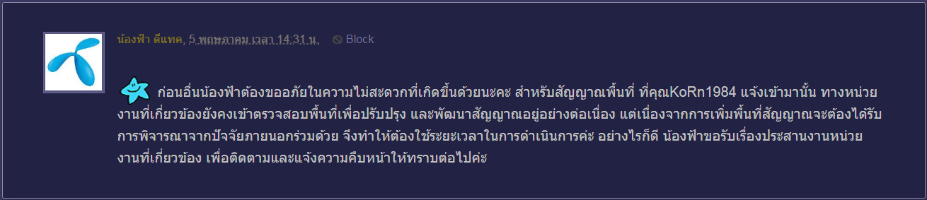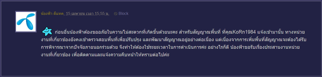 ผมต้องแจ้งอีกมั๊ย!!! หรือต้องแจ้งอีกกี่รอบ ก่อนนี้ก็มีคนนึงก็แจ้งเหมือนกัน ที่กะทู้เกี่ยวกับ Package GO TO LIMIT ผมอ่านดู อ้าว ที่ผมอยู่เลยนี่นา รังสิตคลองหนึ่ง จนป่านนี้ ก็เหมือนเดิมครับ กี่คนแจ้ง ก็เหมือนเดิม แถม DTAC ใบอนุญาตเดิม ก็กำลังจะหมดลงละ ตั้งหลายความถี่ คิดว่า ต่อไปจะเป็นยังไงครับ น้องฟ้า หรือเตรียมตัวจะย้ายค่ายหนีแบบผมเหมือนกัน