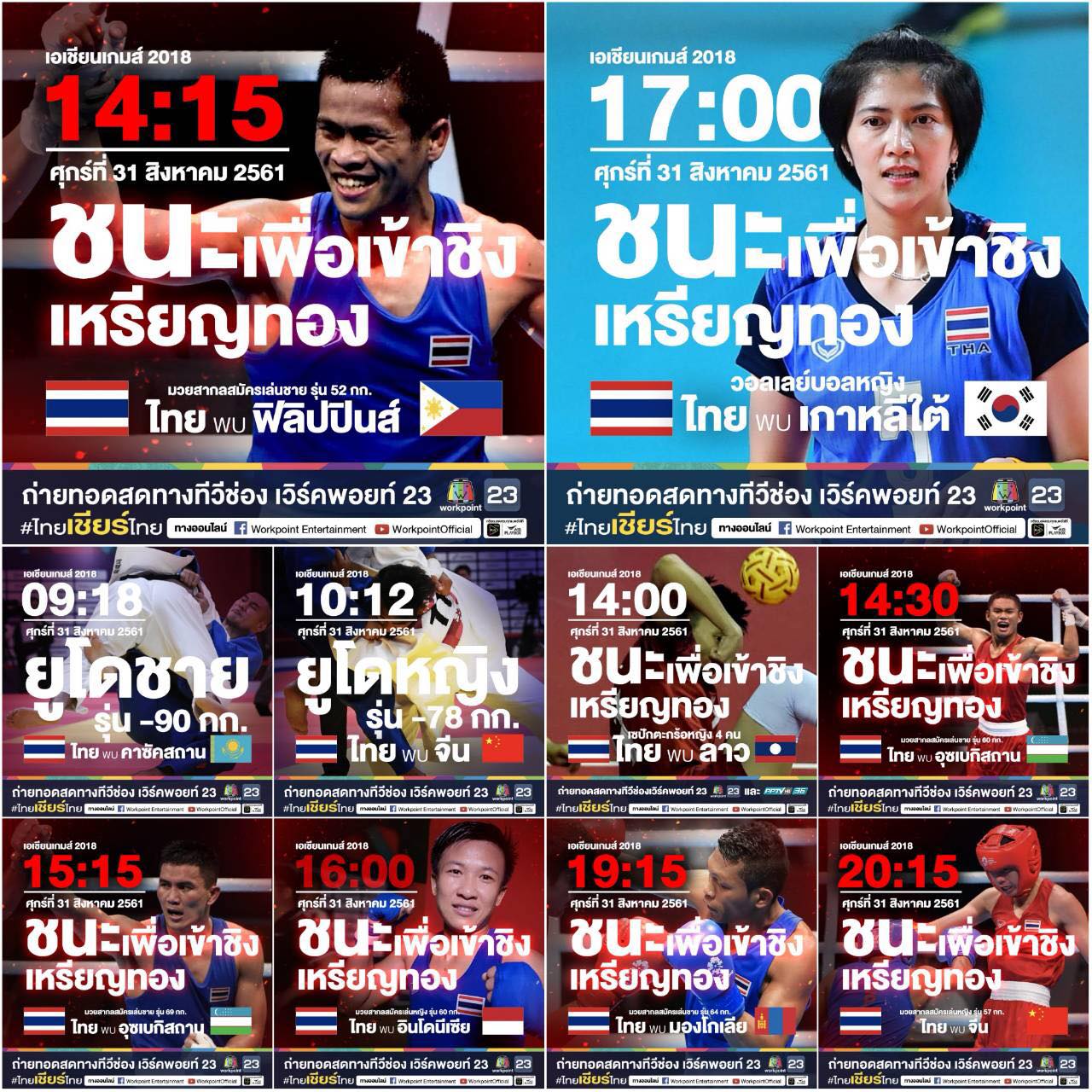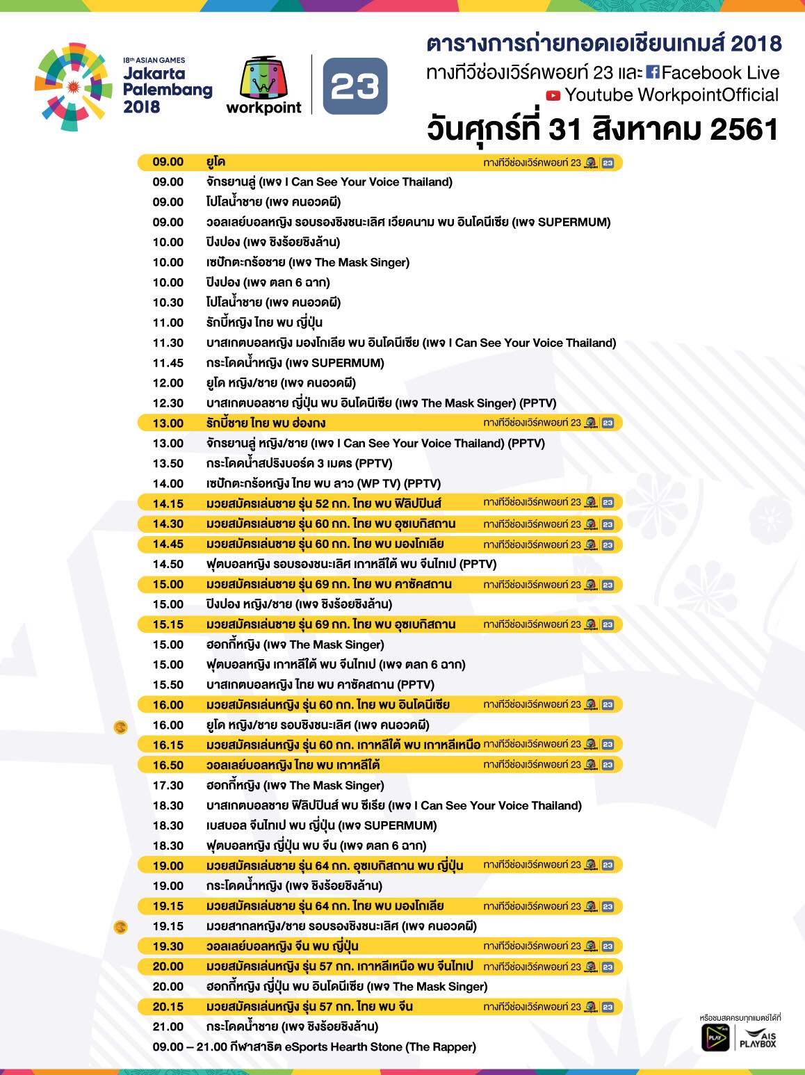 โปรแกรมการถ่ายทอดสด เอเชียนเกมส์ 2018 ทางเครือข่ายของ Workpoint Entertainment, PPTV HD 36 และ AIS Play