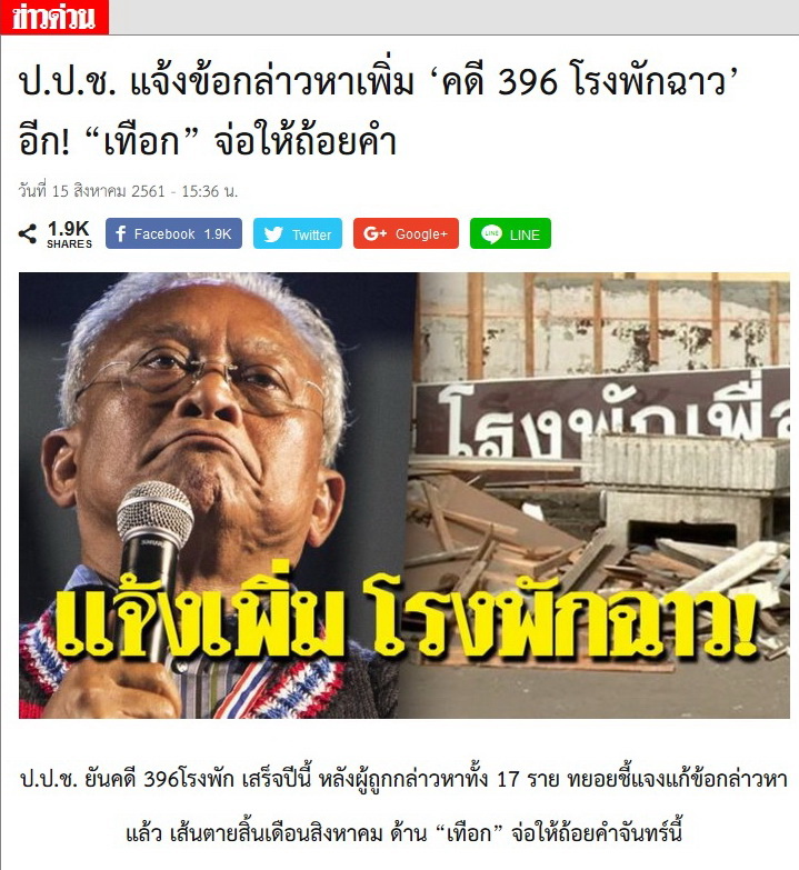 https://www.khaosod.co.th/politics/news_7266052 ระทึกแน่! 20 กย.นี้ ศาลฎีกาฯ นัดพิพากษา สุเทพ กับพวก คดีทุจริตโรงพัก 396 แห่ง 'สุเทพ'ขึ้นศาลคดีทุจริตฯฮั้วประมูลโรงพัก บอกสบายใจขึ้นหลังทุกข์ทรมา