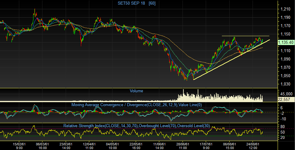 ผ่านขึ้นไปได้ และ ลงมาเคลื่อนไหวเลื้อยเลียคลอเคลียร์ Support line ซึ่งต้องมาดูกันว่า ณ บริเวณนี้ ดัชนีจะสามารถกลับขึ้นไปเหนือ 1150 ได้หรือไม่ เพื่อทำให้ภาพ Cup with Handle ชัดเจนขึ้น และยืนยัน Ascending Triangle / แต่ถ้าหากไม่สามารถ High 1142 หรือระดับ 1150 ขึ้นไปได้