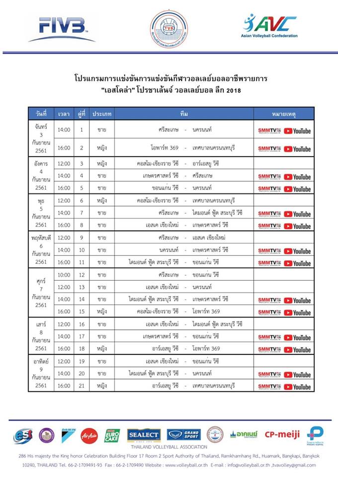 3-9 กันยายน - "เอสโคล่า" โปรชาเล้นจ์ วอลเลย์บอล ลีก 2018 อย่าลืมดูกันนะครับ