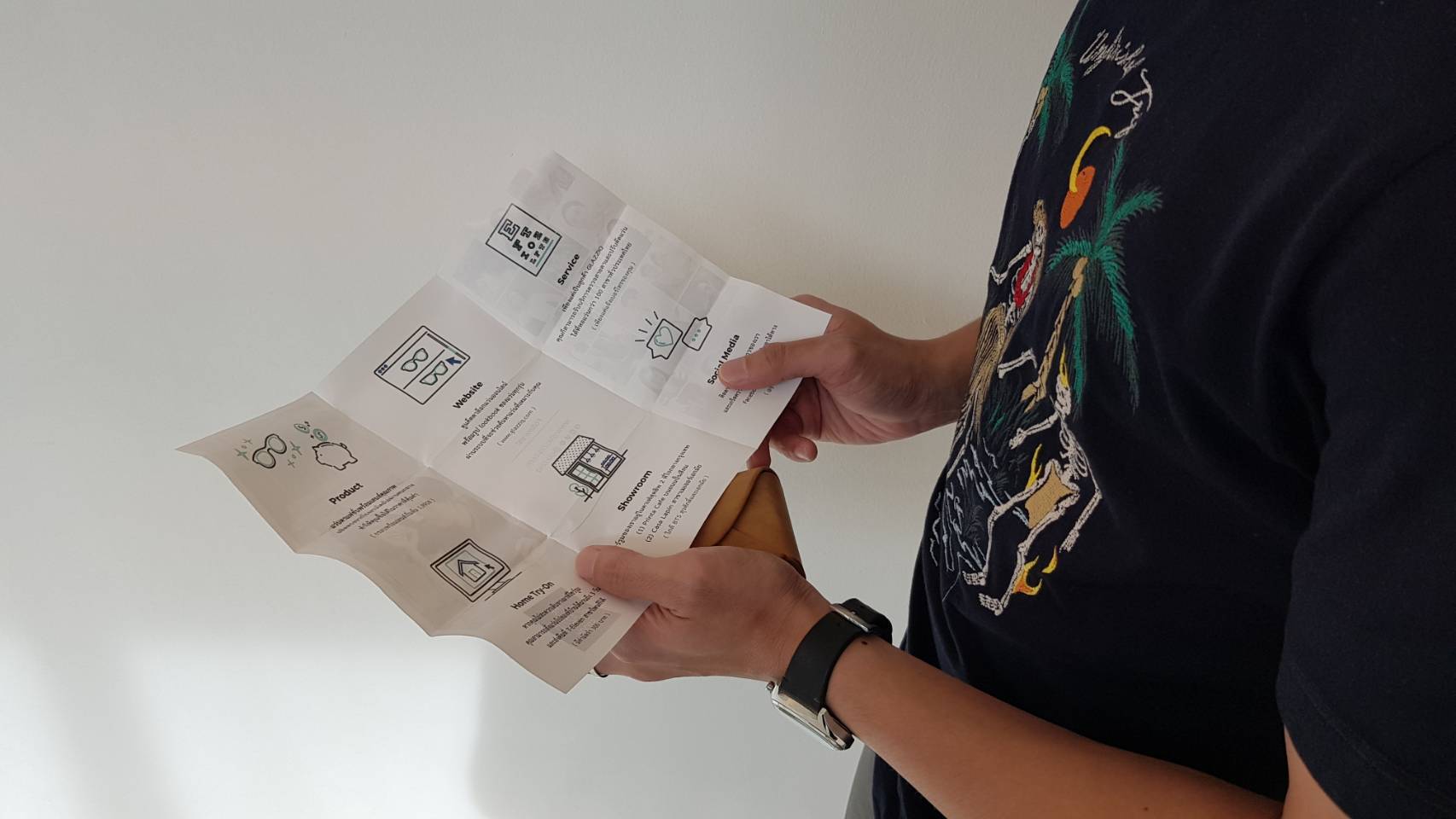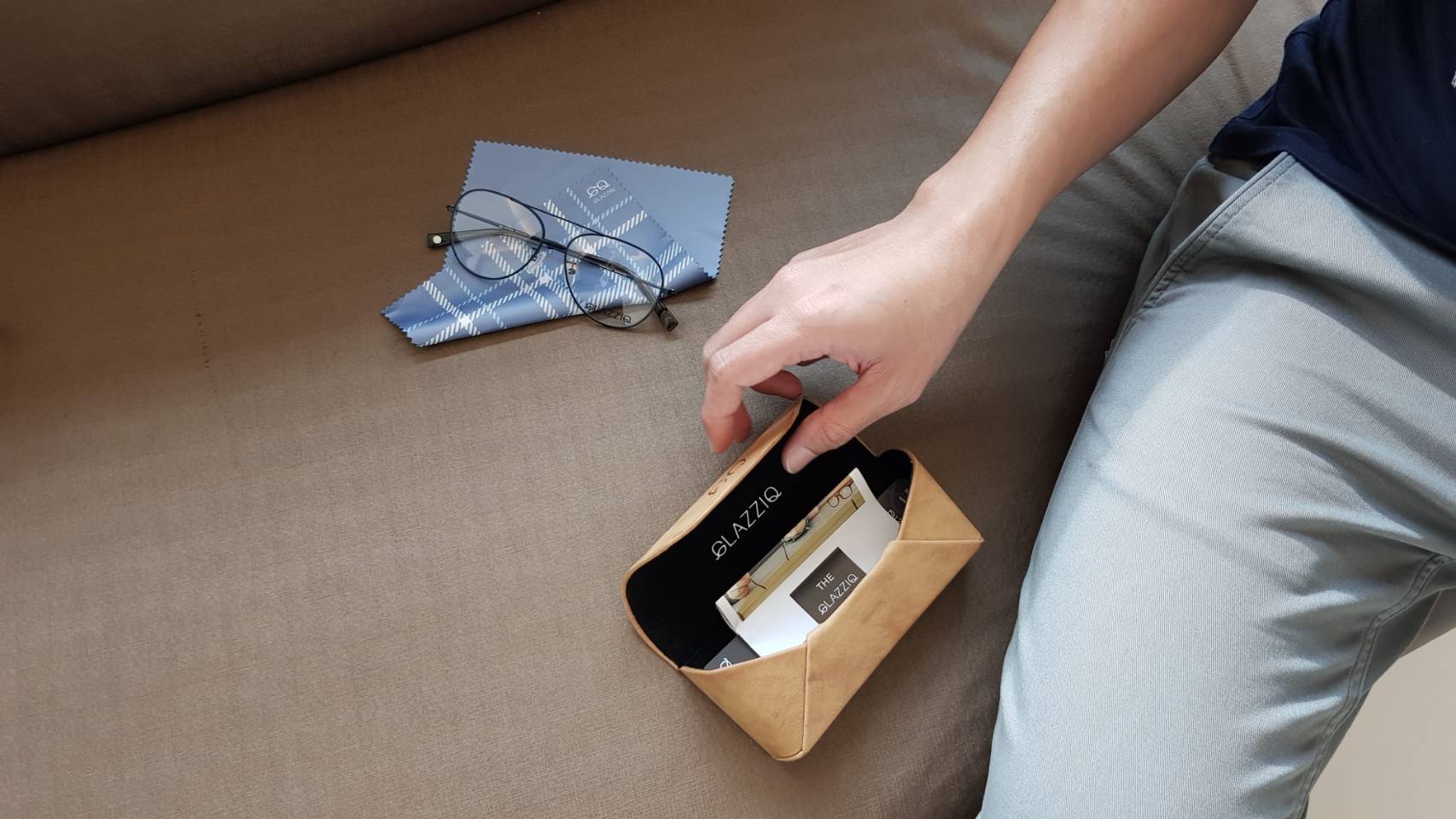 เดี๋ยวเรามาแกะกล่องกันเลย! เปิดกล่องออกมา ก็จะเจอแผ่นพับน่ารักๆ เล่าความเป็นมาของแบรนด์ Glazziq พร้อมผ้าเช็ดแว่นสีฟ้าอมเทา
