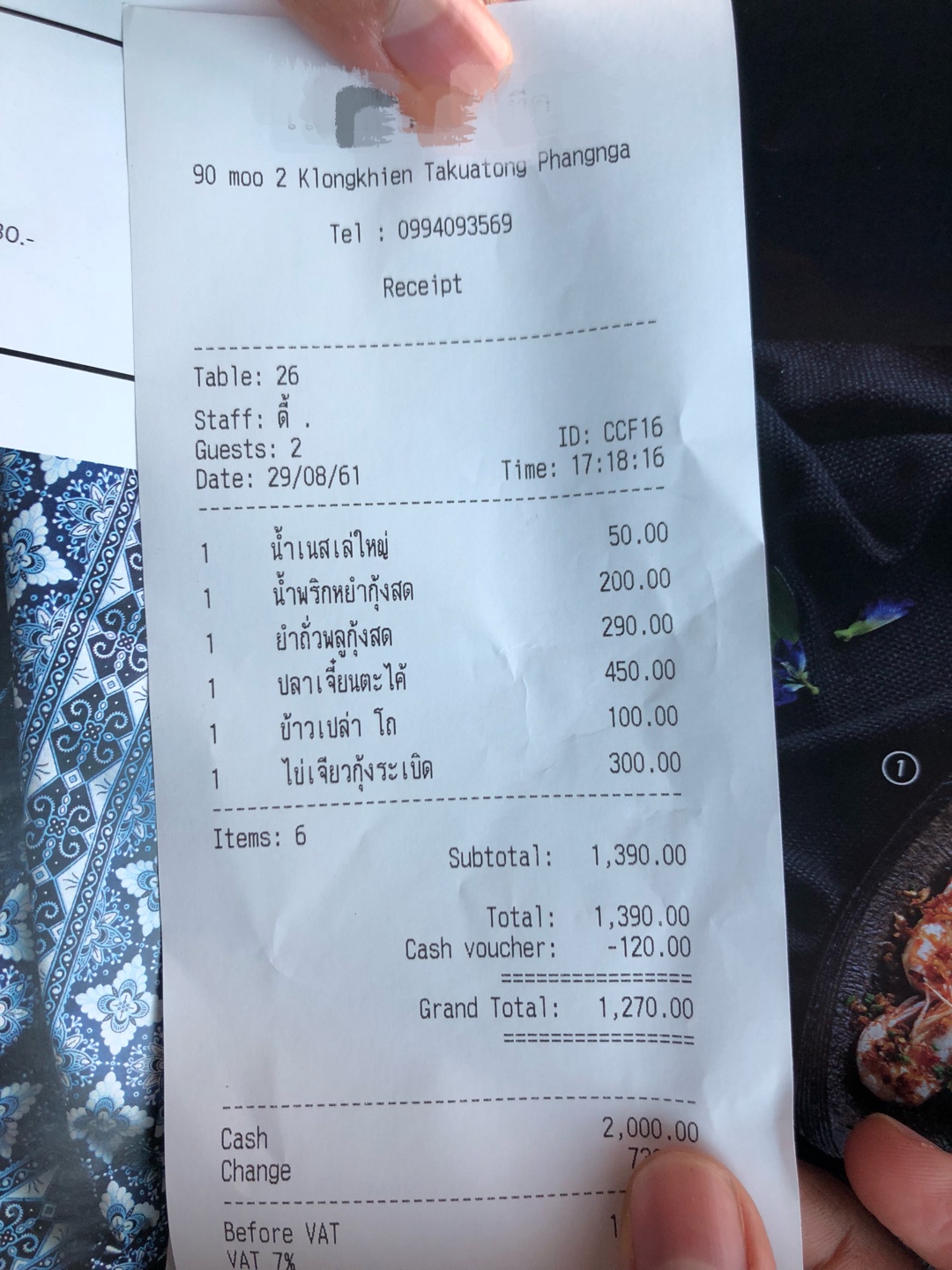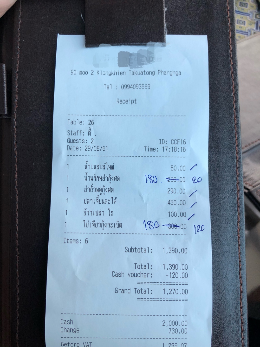 ปล.ยอดส่วนลด (Cash Voucher) 120 บาท ใบบิล คือส่วนลดจากค่าหัวที่จ่ายตอนขึ้นไปที่ร้าน โดยทางร้านคิดคนละ 30 บาท (ไปกัน 4 คน รวม 120 บาท) และพาลูกค้านั่งรถของทางร้านขึ้นไปยังร้านอาหาร ระยะทางประมาณ 600 เมตร จากลานจอดรถ ซึ่งยอด 120 บาท สามารถนำมาหักเป็นส่วนลดได้เมื่อทานอาหารที่ร้าน