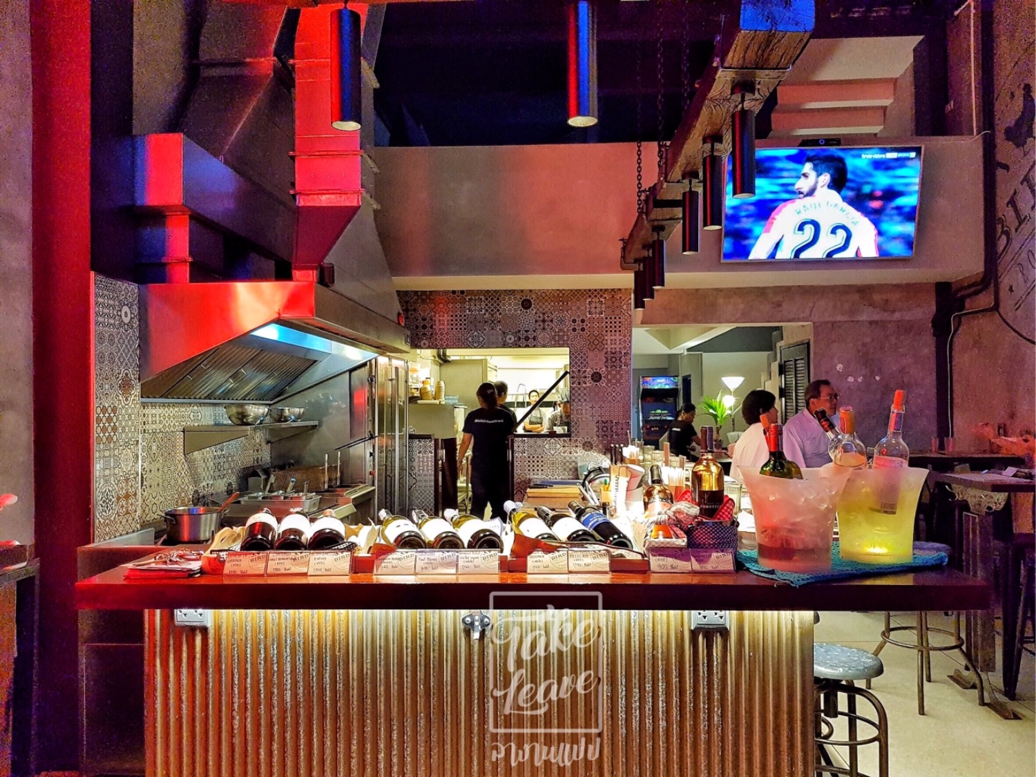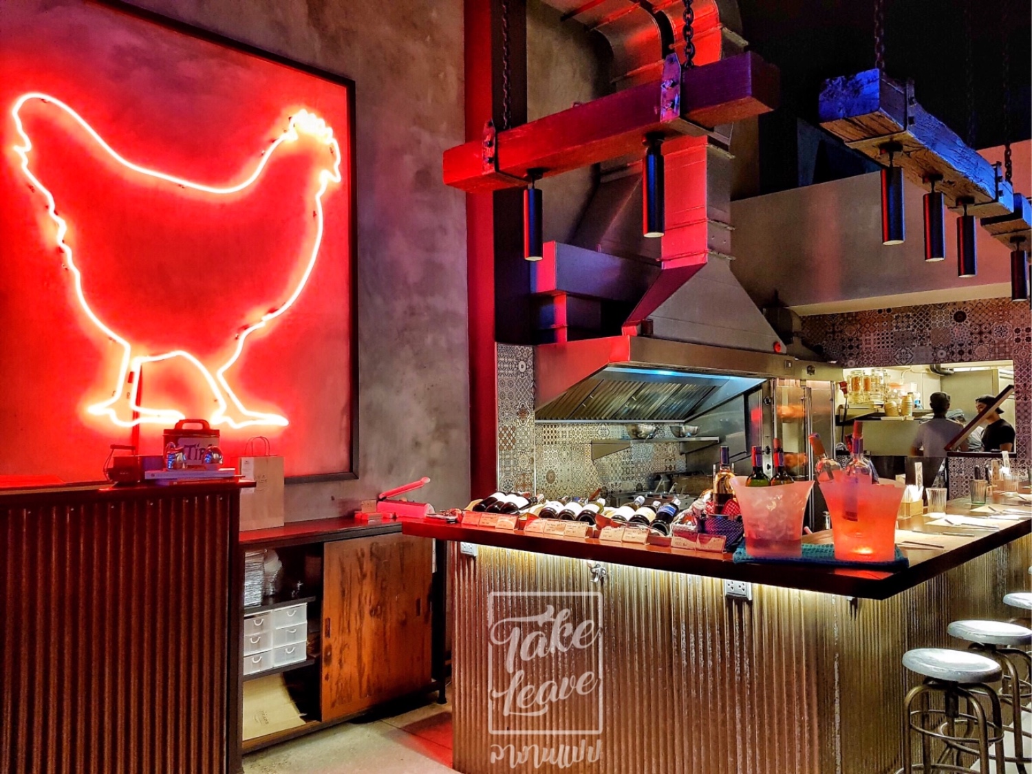 เมื่อเปิดประตูเข้าไปก็พบกับบรรยากาศดเบๆ มีความเรียบง่าย เน้นวัสดุทำจากเหล็ก ไม้ และซีเมนต์ บนผนังประดับด้วยไฟนีออนสีแดงรูปไก่