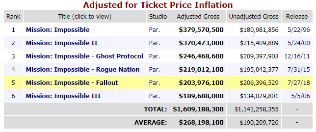 แม้ว่าเมื่อปรับค่าเงินตามเงินเฟ้อแล้ว Fallout ทำได้ดีเพียงแค่อันดับที่ 5 จากทั้งหมด 6 ตอน