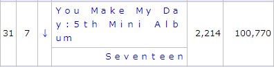 HANTEO #SEVENTEEN — #YOU_MAKE_MY_DAY : 9,921 TOTAL : 268,253 COPIES. surpassed 260k #GFRIEND — #SUNNYSUMMER : 2,211 TOTAL : 16,179 COPIES. #GOLDENCHILD — #GOLDENNESS : 1,310 TOTAL