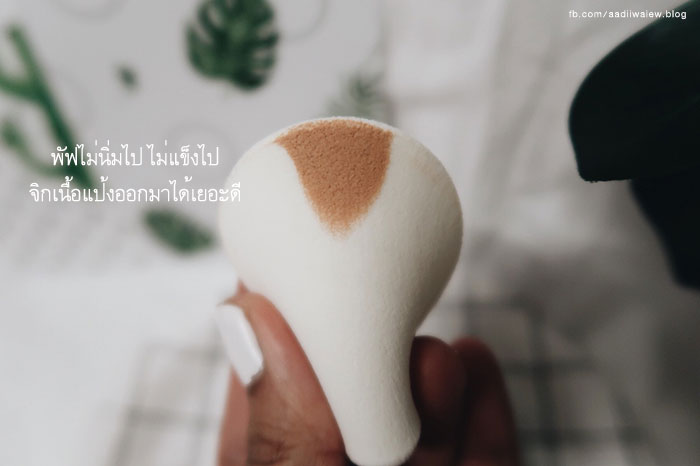 มาเจาะรายละเอียดของพัฟกันหน่อน พัฟเป็นสีขาวเนื้อนิ่มอยู่นะคะ แต่ไม่นิ่มเกินไป หรือด้านเกินไป กำลังดีเลย สามารถจิกเนื้อแป้งออกมาได้ดี ที่สำคัญคือเค้าไม่กินเนื้อแป้ง ใช้เกลี่ยแป้งบนหน้าได้เนียนอยู่จ้า