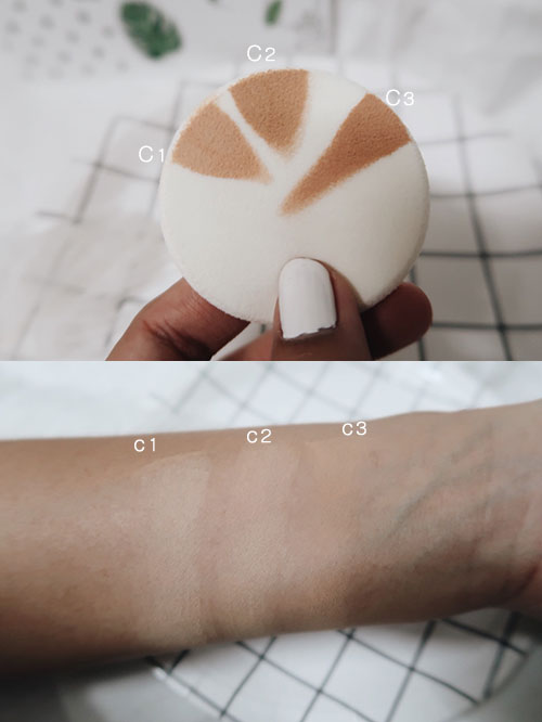 เราว่าสีเค้าออกค่อนไปทางเฉดสีผิวคนไทย เพราะฉะนั้นใช้ได้ ไม่โดด ไม่เทาแน่นอน ส่วนเนื้อแป้งที่ให้มาอัดมาในตลับ ค่อนข้างแน่นนะ ไม่ได้เป็นผงๆ ถือว่าคุณภาพดีอยู่เลย เนื้อแป้งไม่หนาจนเกินไป ทำให้ไม่ค่อยเสี่ยงต่อการแป้งแตกระหว่างวัน จากการ Swatch ข้างบน เห็นเลยว่า เนื้อแป้งไม่หนา เพราะฉะนั้น คนที่มีรอยดำสิวเข้มๆ หรือ ใต้ตาคล้ำมากๆ อาจจะต้องคอนซีลเลอร์นิดนึง แต่ในส่วนรอยแดงสิว หรือรอยดำจางๆ ปิดได้ดีอยู่ค่ะ