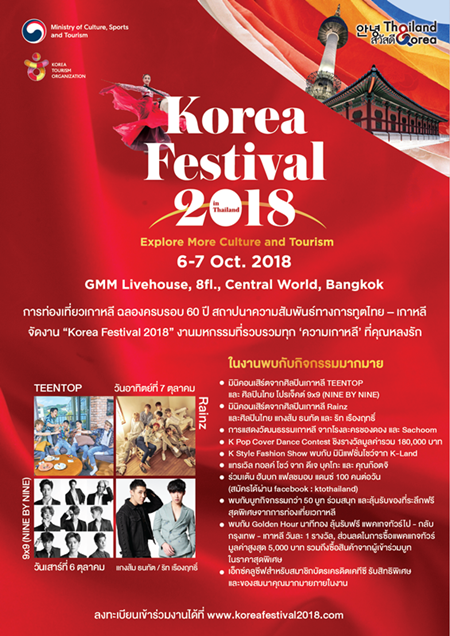 องค์การส่งเสริมการท่องเที่ยวเกาหลี ชวนร่วมงาน Korea Festival 2018 วันที่ 6-7 ตุลาคม 2561 ที่ GMM Live House Central