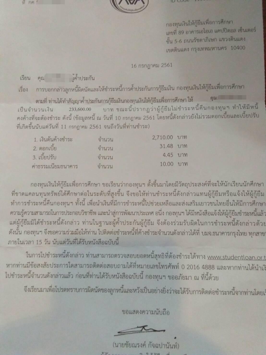 ปี 2561 แจ้งยอดให้ชำระเงิน ผมดันเข้าใจผิดคิดว่าจ่ายไปแล้วไม่ต้องจ่ายซ้ำ เลยมีจดหมายทวงไปที่ คนที่เคยรับรองเงินเดือนให้แม่ผม แล้วผมก็เลยรีบไปชำระ แล้วสอบถามว่าเคยจ่ายไปแล้วเงินไปไหน คำตอบคือเงินที่เคยจ่ายไปก่อนหน้ามันกลายไปโปะยอดรวมแทน