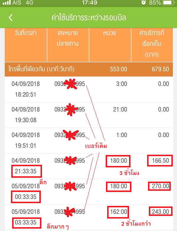 (แจ้ง Call Center 1148 ไปแล้ว ขณะนี้เจ้าหน้าที่กำลังตรวจสอบ และพิจารณาอยู่ว่าจะแก้ไขอย่างไรได้บ้างในส่วนยอดที่เกิน ยืนยันว่าแม่ไม่ได้โทร แล้วเบอร์ปลายสายซึ่งเป็นพี่สาวคนโตก็ไม่ได้คุยเวลานั้นๆ)