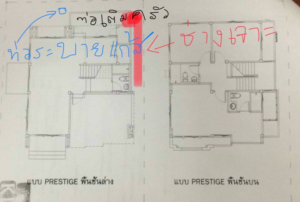 ตรงที่ระบายสีแดงคือช่างเจาะไปแล้ว ไม่เจอบ่อค่ะ ตอนนี้ปรึกษากันว่าจะเจาะตรงที่ใกล้ๆกับท่อระบายแก้ส ซึ่งบริเวณนั้นคือต่อเติมเป็นครัวค่ะ ถ้าจะเจาะจริงก็คือต้องทำใหม่ทั้งหมด