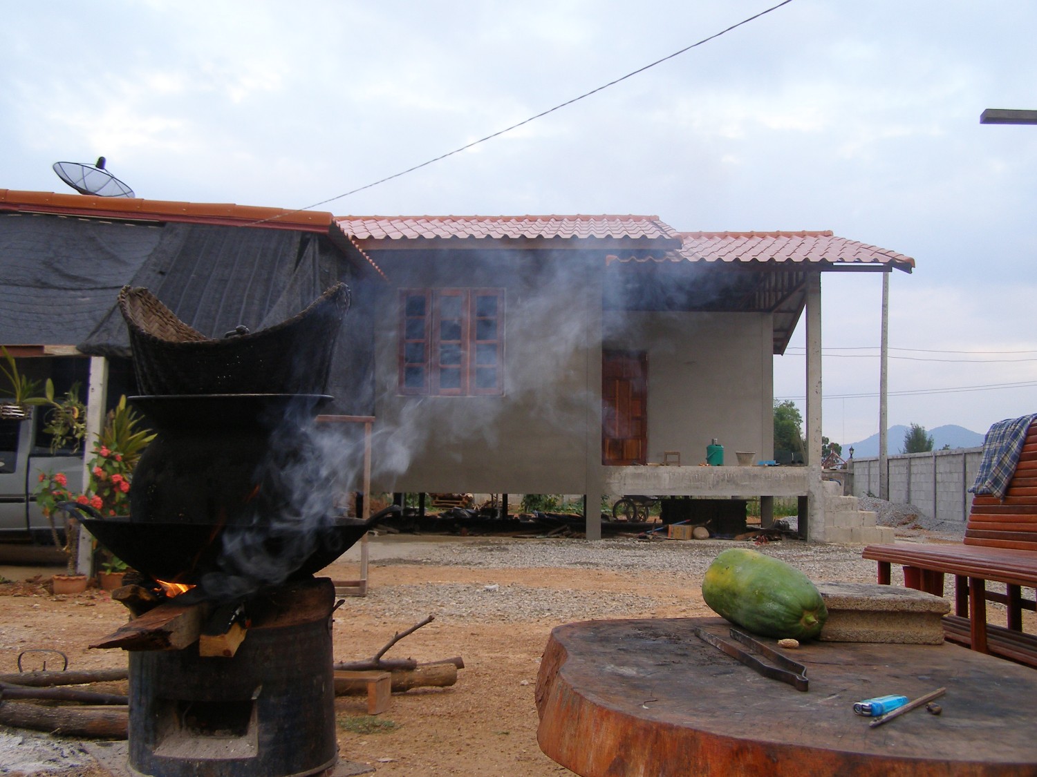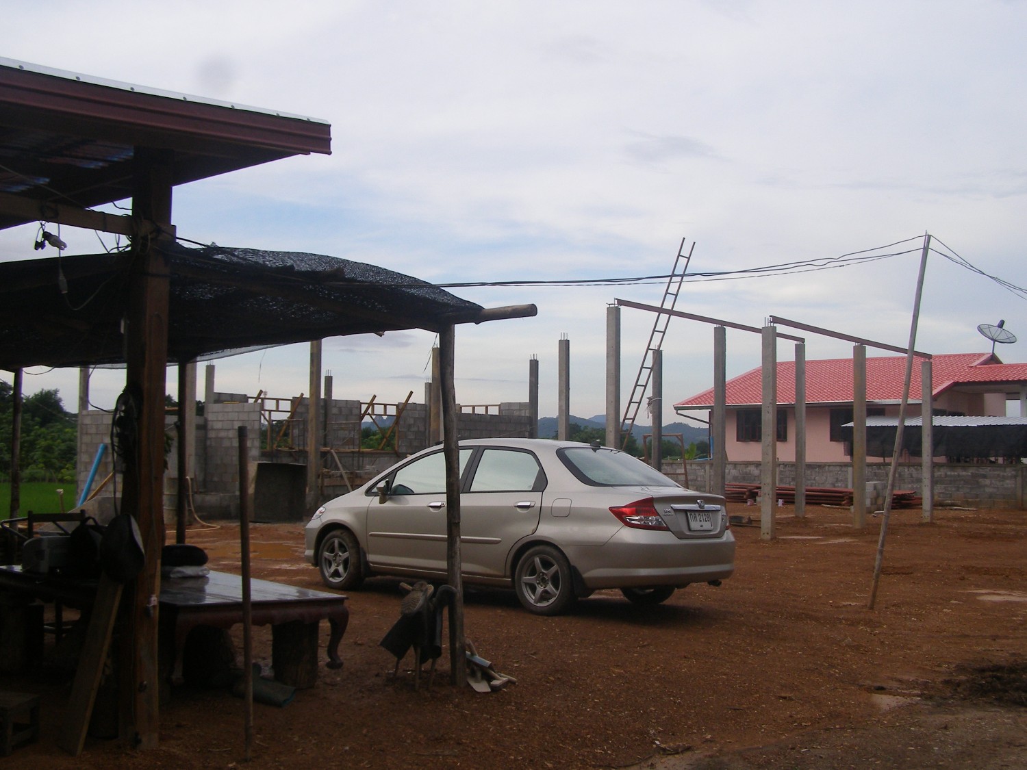 เราสร้างโรงรถก่อนเป็นอันดับแรกเพื่อให้ช่างพัก จากนั้นจึงสร้างหลังครัวเพื่อให้เราสองคนย้ายมาอยู่เป็นการประหยัดค่าใช้จ่ายในการเช่าห้องแต่ละเดือนได้อีกทาง ที่สำคัญคือหากได้มาอยู่ในเวลาเช้าและเย็น อย่างน้อยก็ได้เก็บกวาดช่วยงานก่อสร้างไปด้วย มีเวลาก็ปลุกต้นไม้ ปลูกพืชสวนครัวที่เราอยากกินในอนาคต