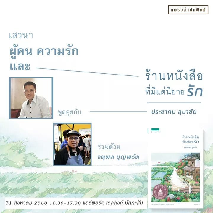 วันนี้ผมนำเสนอรายละเอียดที่น่าสนใจจากเวทีการเสวนาในหัวข้อ “ผู้คน ความรักและร้านหนังสือที่มีแต่นิยายรัก” โดยงานนี้จัดขึ้นเมื่อวันศุกร์ที่ 31 สิงหาคม 2561 ในงานกิจกรรม “นายอินทร์ สนามอ่านเล่น” ที่แอร์พอร์ต เรลลิงก์ มักกะสัน ซึ่งผมคิดว่ารายละเอียดจากงานในครั้งนี้น่าจะให้ข้อคิดที่เป็นประโยชน์สำหรับนักอ่านและผู้ที่สนใจการเขียนทุกท่าน