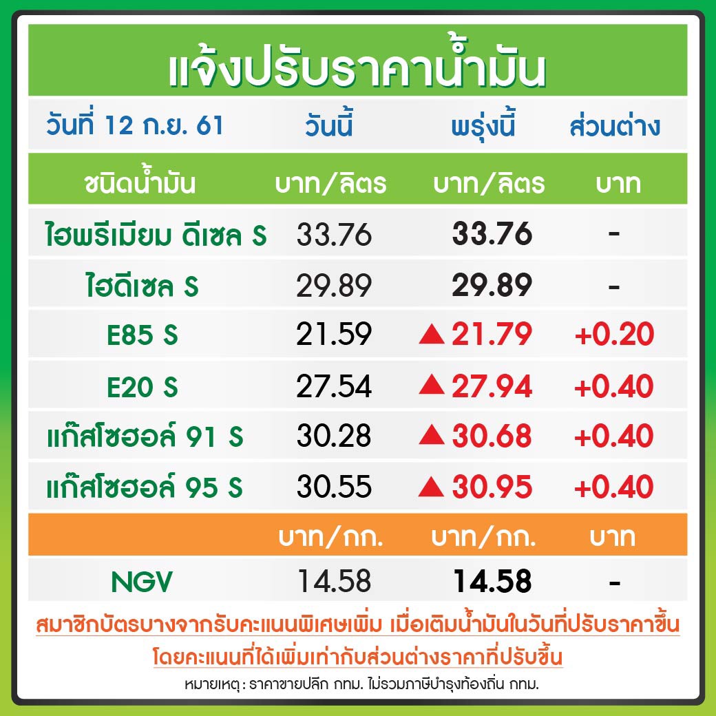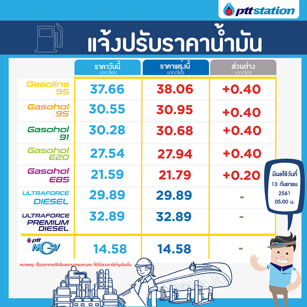 บริษัท ปตท. จำกัด (มหาชน) ประกาศปรับราคาน้ำมัน ราคาขายปลีกน้ำมันเบนซิน แก๊สโซฮอล์ขึ้น 40 สตางค์ต่อลิตร ยกเว้น E85 เพิ่มขึ้น 20 สตางค์ต่อลิตร มีผลวันที่ 13 กันยายน 2561