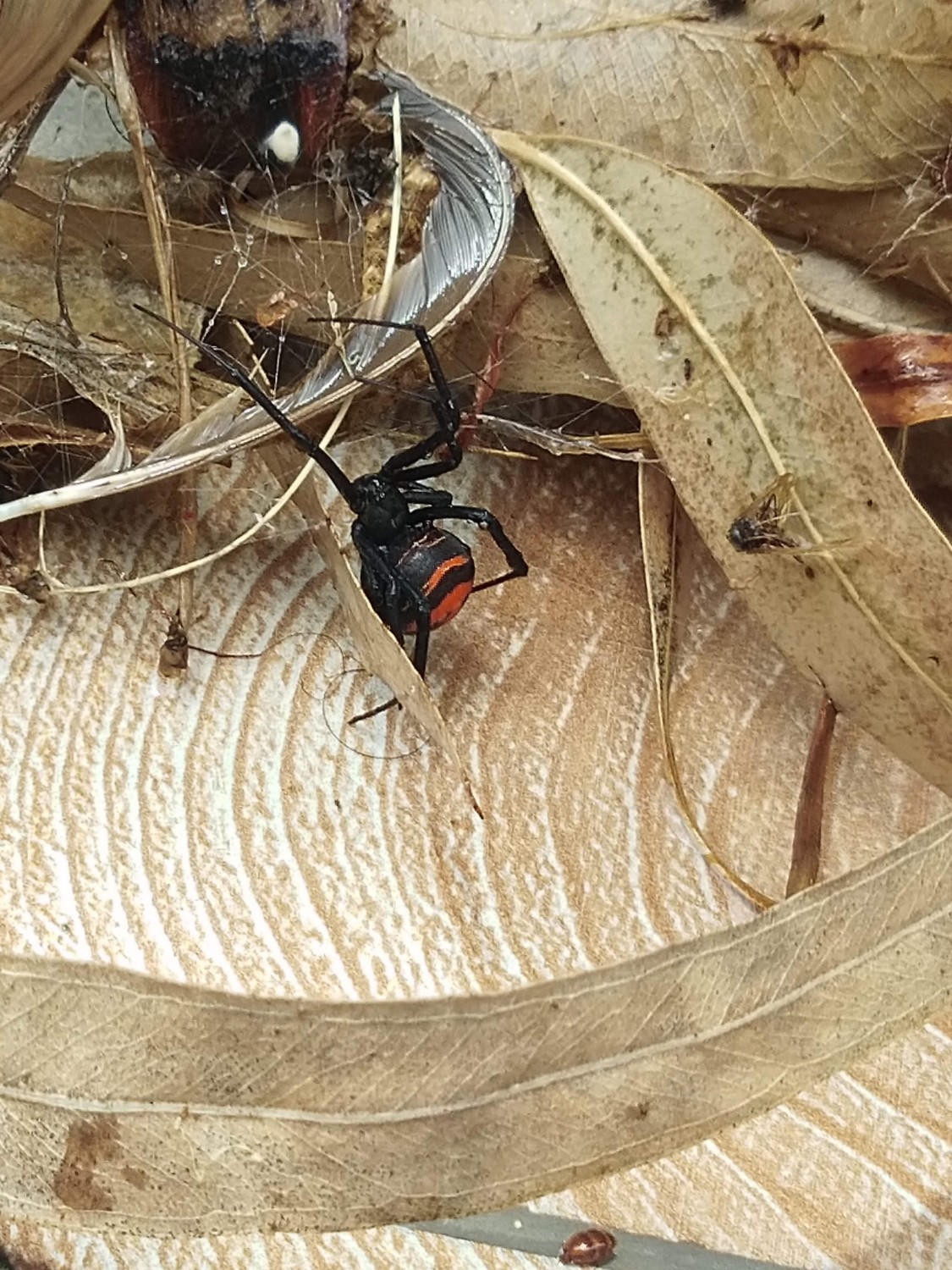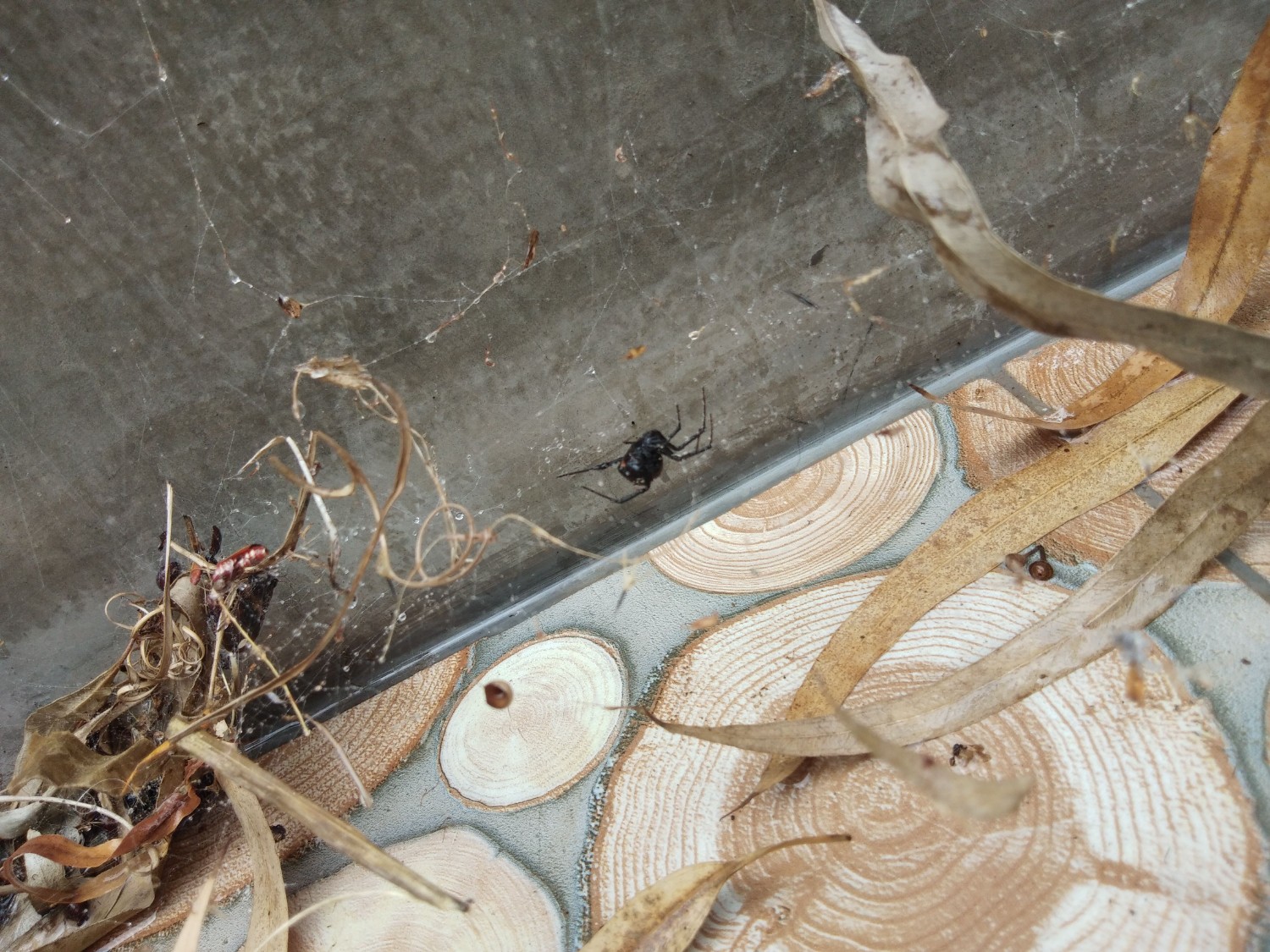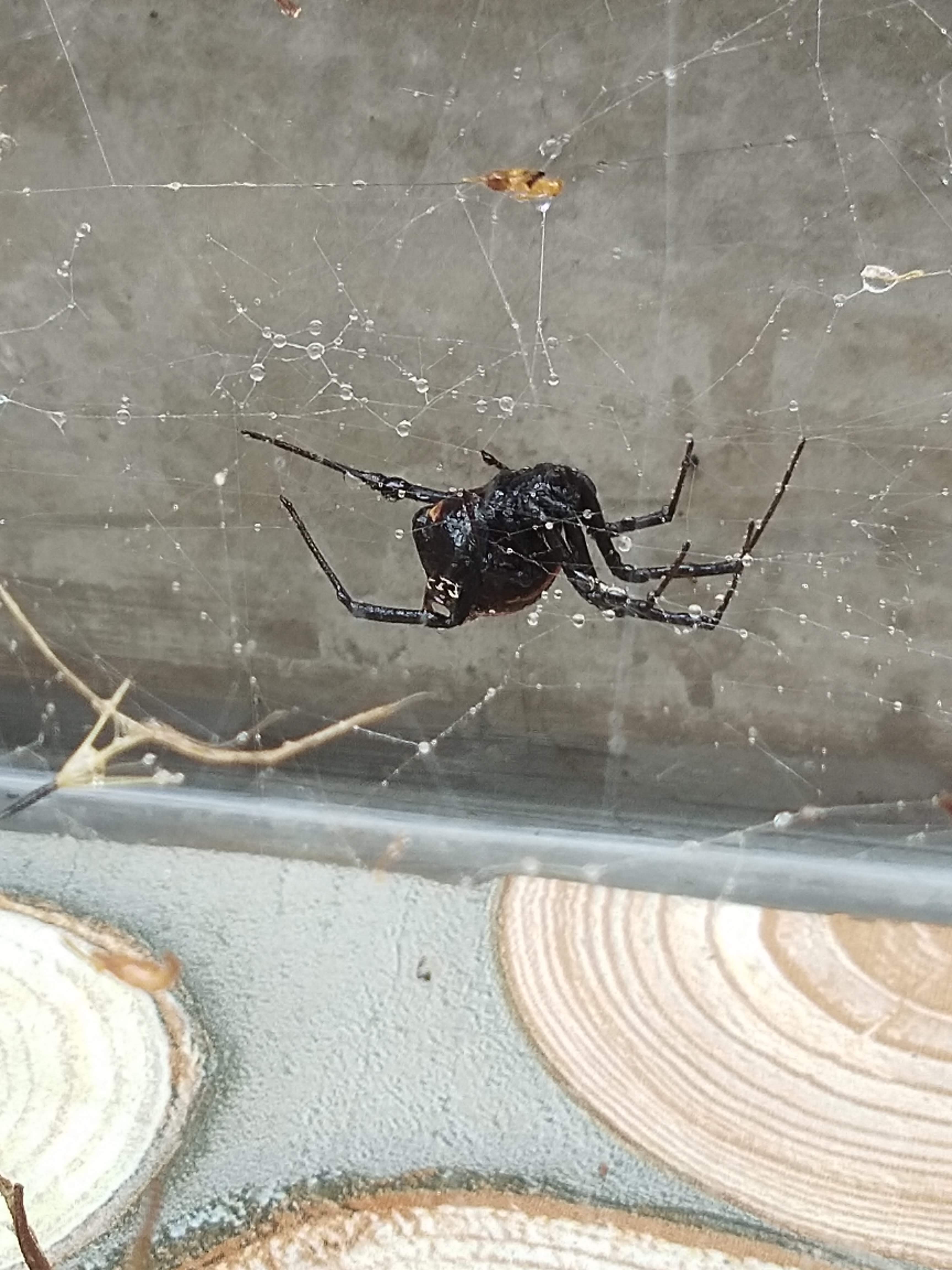 พอดีหลังบ้านผมจะมีพวกใบไม้พัดมากองกันอยู่บ่อยๆ เลยคิดว่านานๆทีจะออกไปกวาดสักที . วันนี้ไม่รู้นึกยังไงไปเจอรังแมงมุมที่พื้นตรงนั้นเข้า . ดูไม่เหมือนทั่วๆไปเลยครับ รังดูพันกันอลเวงเหลือเกินกับกองใบไม้ . เลยกวาดๆดู ก็เจอเจ้าตัวนี้โผล่ออกมาในท่าทางที่นิ่งมาก เห็นก้นป่องๆหลังแดงๆเลยจัดการเอาใบก้อนซัดเข้าให้ ก็เห็นยังกิ้นๆอยู่ เลยจัดการเอาพี่เป็ดราดซ้ำลงไป ปรากฏว่าแน่นนิ่งไปเลยครับ