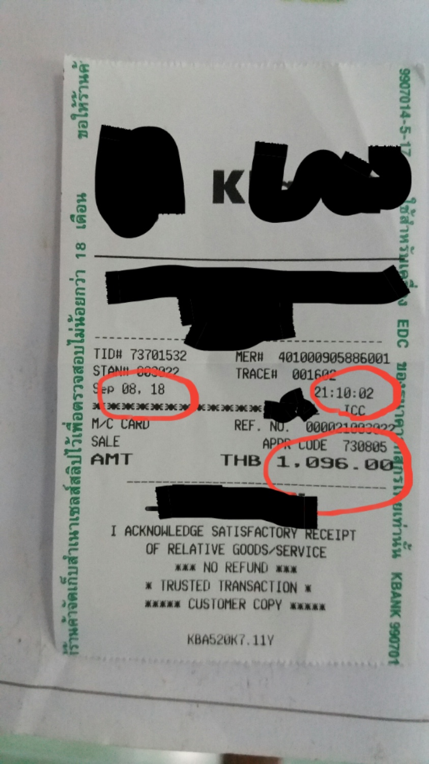 วันเสาร์ที่ผ่านมา ผมกับแฟนไปซื้อของที่ห้างใหญ่สีเขียวแถวภาคอิสาน จังหวัดที่มีข้าวหอมมะลิอร่อยๆอ่ะคับ ประมาณพันกว่าบาท แล้วก็รูดบัตรเครดิตตามปกติ