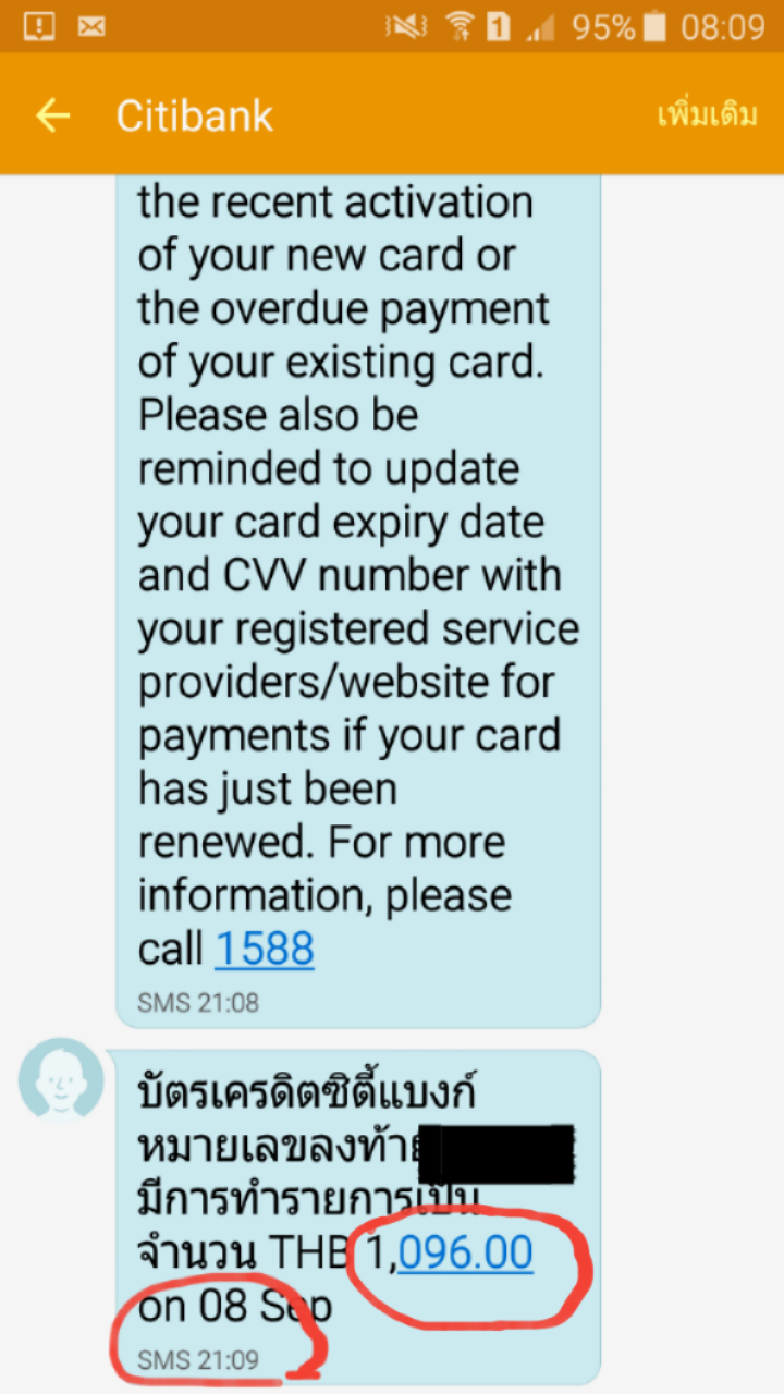 พอวันอาทิตย์ก็กลับไปซื้อของอิกเพราะมีส่วนลด อิ อิ แต่ก็เอะใจอยากลองใช้บัตรซิตี้แบงค์ดูเพราะทางแบงค์ก็แจ้งมาแล้วว่าบัตรเปิดแล้ว ก็เลยเปิด SMS ดูก็พบข้อความนี้