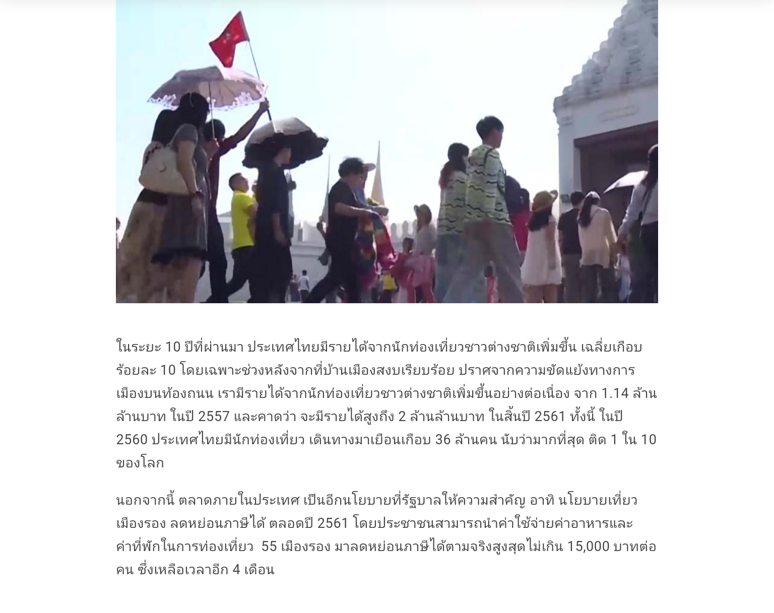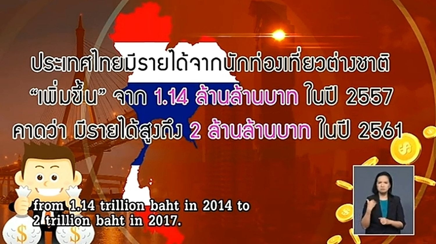 ทั้งนี้ เป็นภาพพจน์ดีๆ ของประเทศไทย ในสายตาชาวโลกอีกครั้งหลังจากที่เราได้รับการโหวตให้เป็น ประเทศที่ดีที่สุดสำหรับผู้คนอันดับ 1 ของโลก จากนิตยสารท่องเที่ยวชั้นนำสหรัฐฯ ซึ่งได้นำมากล่าวเมื่อสัปดาห์ที่ผ่านมา ทั้งนี้ ในระยะ 10 ปีที่ผ่านมา ประเทศไทยมีรายได้จากนักท่องเที่ยวชาวต่างชาติ เพิ่มขึ้น เฉลี่ยเกือบร้อยละ 10 โดยเฉพาะช่วงหลังจากที่บ้านเมืองสงบเรียบร้อยปราศจากความขัดแย้งทางการเมืองบนท้องถนน เรามีรายได้จากนักท่องเที่ยวชาวต่างชาติ เพิ่มขึ้นอย่างต่อเนื่อง จาก 1.14 ล้านล้านบาท ในปี 2557 และคาดว่าจะมีรายได้สูงถึง 2 ล้านล้านบาท ในสิ้นปีนี้ โดยในปีที่แล้วประเทศไทยมีนักท่องเที่ยว เดินทางมาเยือนเกือบ 36 ล้านคน นับว่ามากที่สุดติด 1 ใน 10 ของโลกอีกด้วย