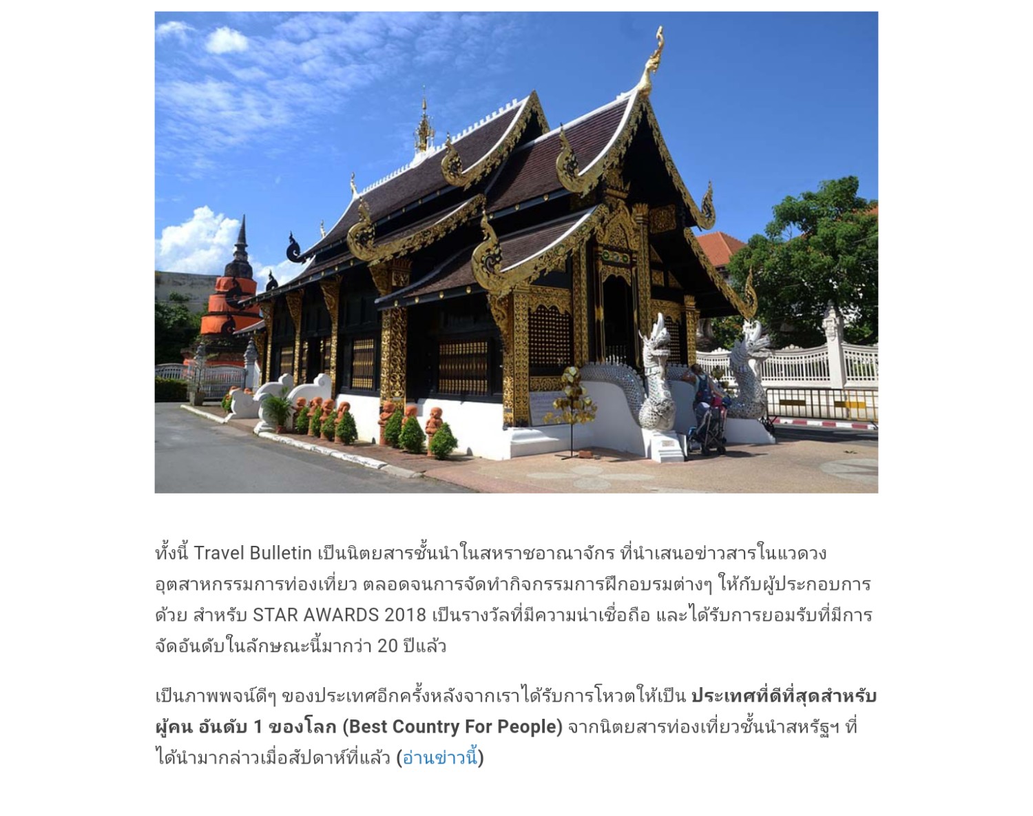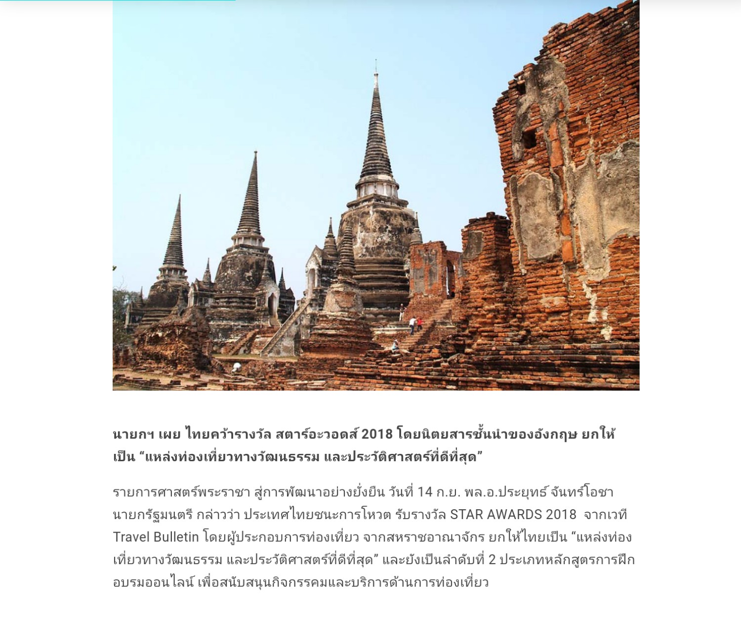 เมื่อวันที่ 14 ก.ย.พล.อ.ประยุทธ์ จันทร์โอชา นายกรัฐมนตรี กล่าวในรายการศาสตร์พระราชาสู่การพัฒนาที่ยั่งยืน ตอนหนึ่งว่า มีเรื่องน่ายินดีของบ้านเมืองที่ต้องบอกกล่าว คือ ประเทศไทยได้รับเกียรติ ให้ชนะการโหวต จากเวที Travel Bulletin ที่เรียกว่ารางวัล STAR AWARDS 2018 ซึ่งบรรดาผู้ประกอบการท่องเที่ยวในสหราชอาณาจักร ยกให้ประเทศไทย เป็นแหล่งท่องเที่ยวทาง วัฒนธรรมและประวัติศาสตร์ที่ดีที่สุด อีกทั้งยังเป็นลำดับที่ 2 ในประเภทหลักสูตรการฝึกอบรมออนไลน์เพื่อสนับสนุนกิจกรรมและบริการด้านการท่องเที่ยวทั้งนี้ Travel Bulletin เป็นนิตยสารชั้นนำในสหราชอาณาจักร ที่นำเสนอข่าวสารในแวดวงอุตสาหกรรมการท่องเที่ยว ตลอดจนการจัดทำกิจกรรมการฝึกอบรมต่างๆ ให้กับผู้ประกอบการด้วย สำหรับSTAR AWARDS 2018 เป็นรางวัลที่มีความน่าเชื่อถือและได้รับการยอมรับ ที่มีการจัดอันดับในลักษณะนี้ มากว่า 20 ปีแล้ว